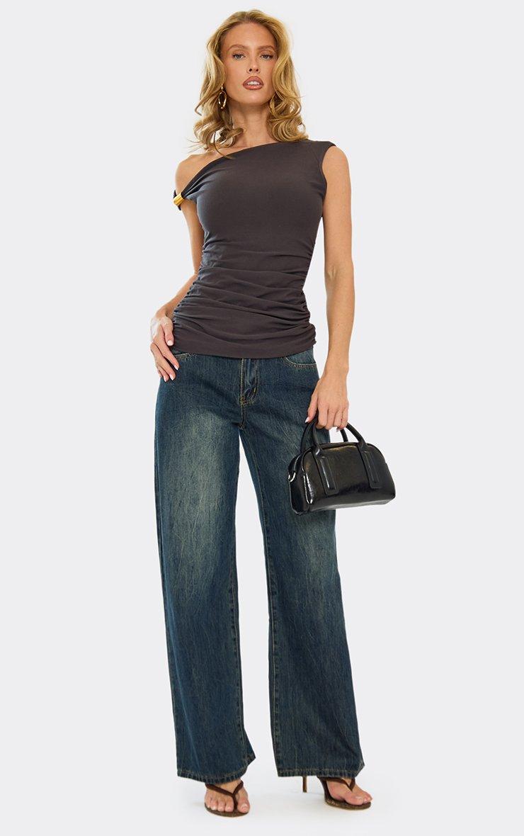 One Shoulder Ruched Trim Detail Top In Charcoal Grey