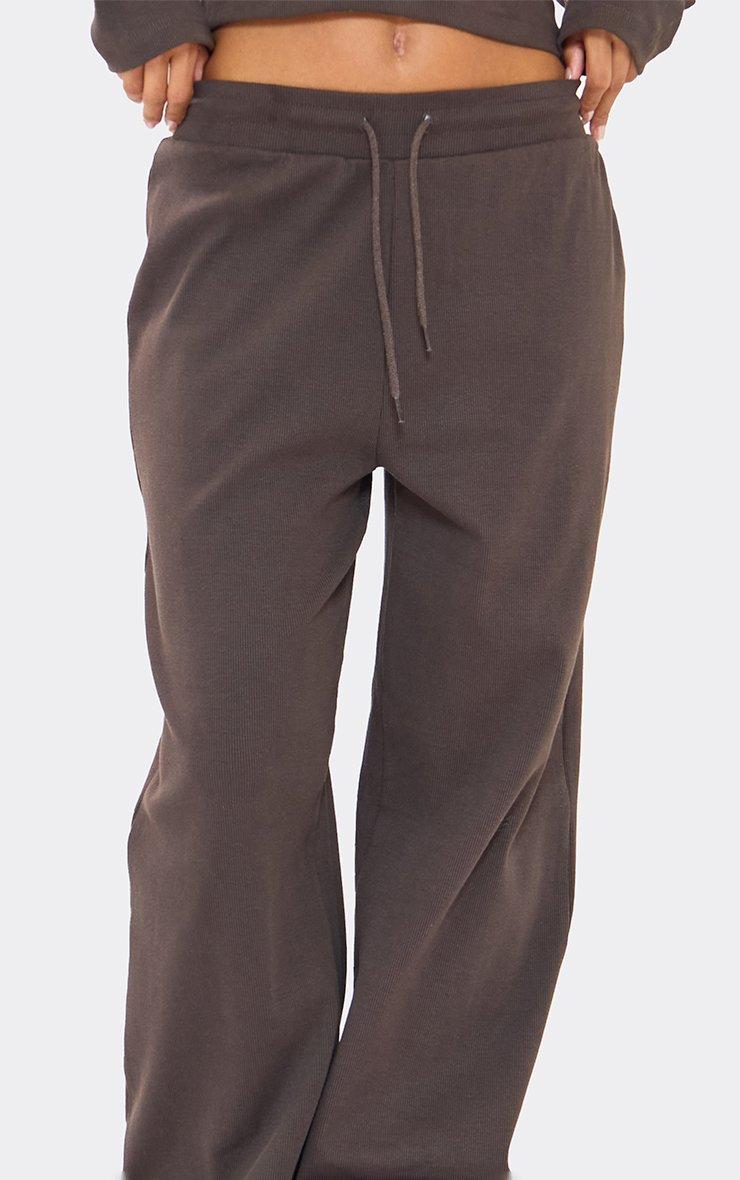 Mid Rise Drawstring Wide Leg Trousers In Chocolate Brown Ribbed