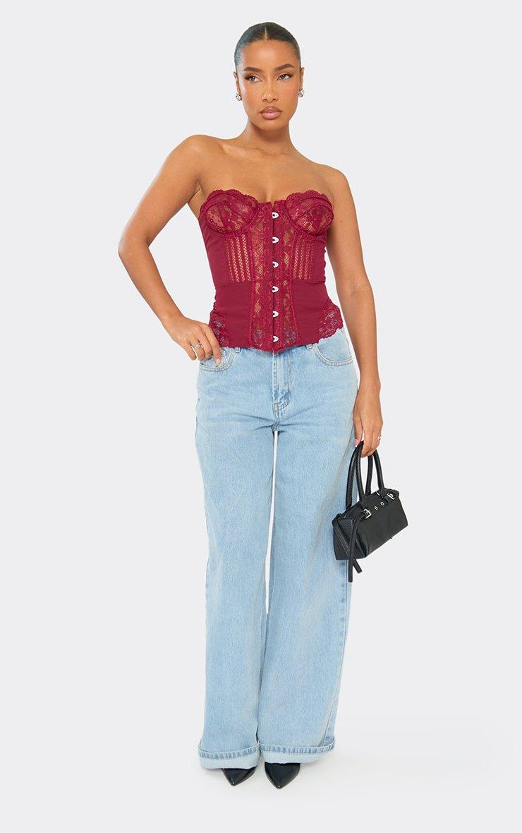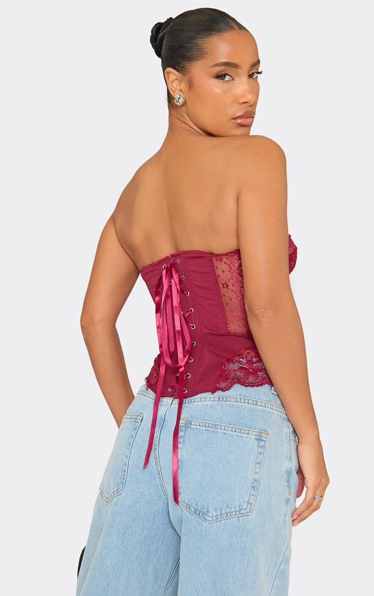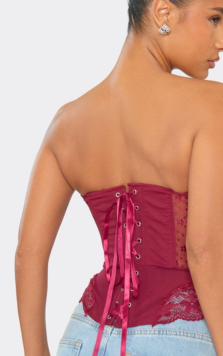 Bandeau Hook And Eye Corset Top In Burgundy Lace