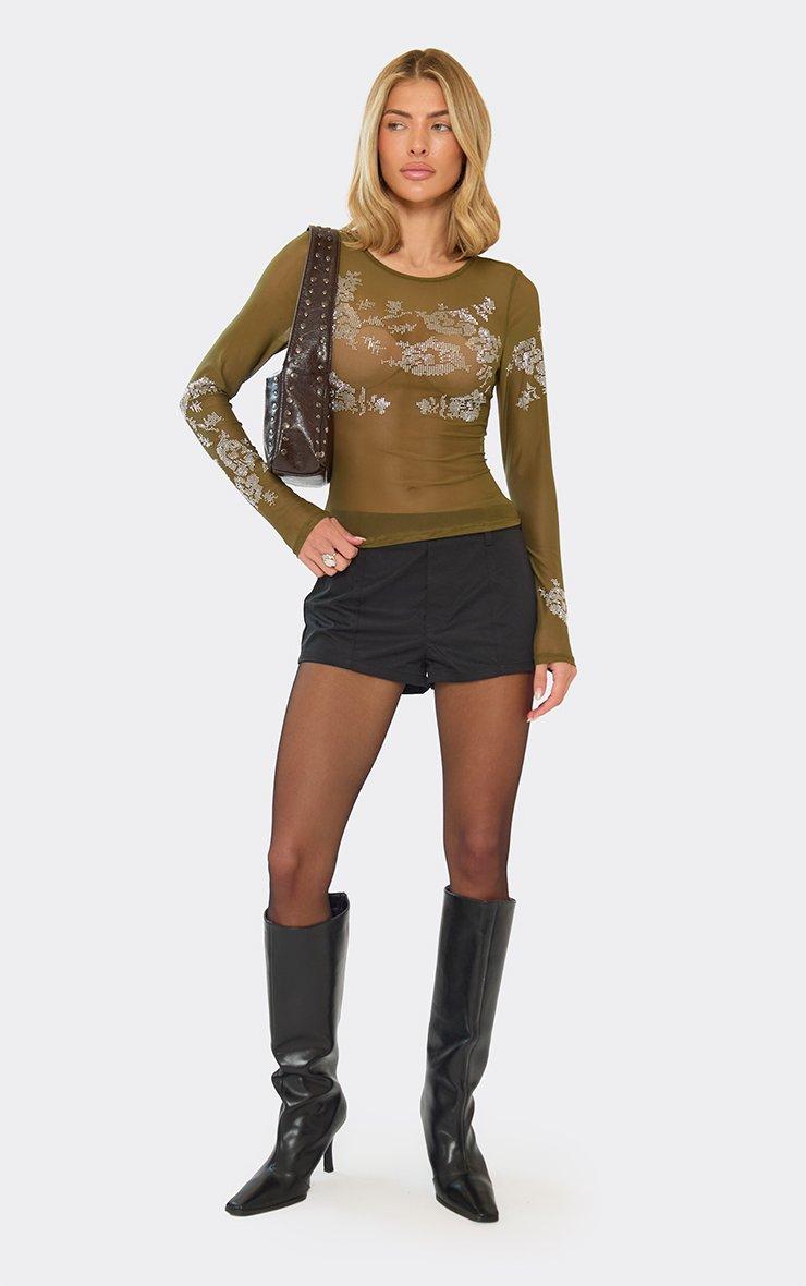 Long Sleeve Embellished Detail Top In Khaki Green Mesh