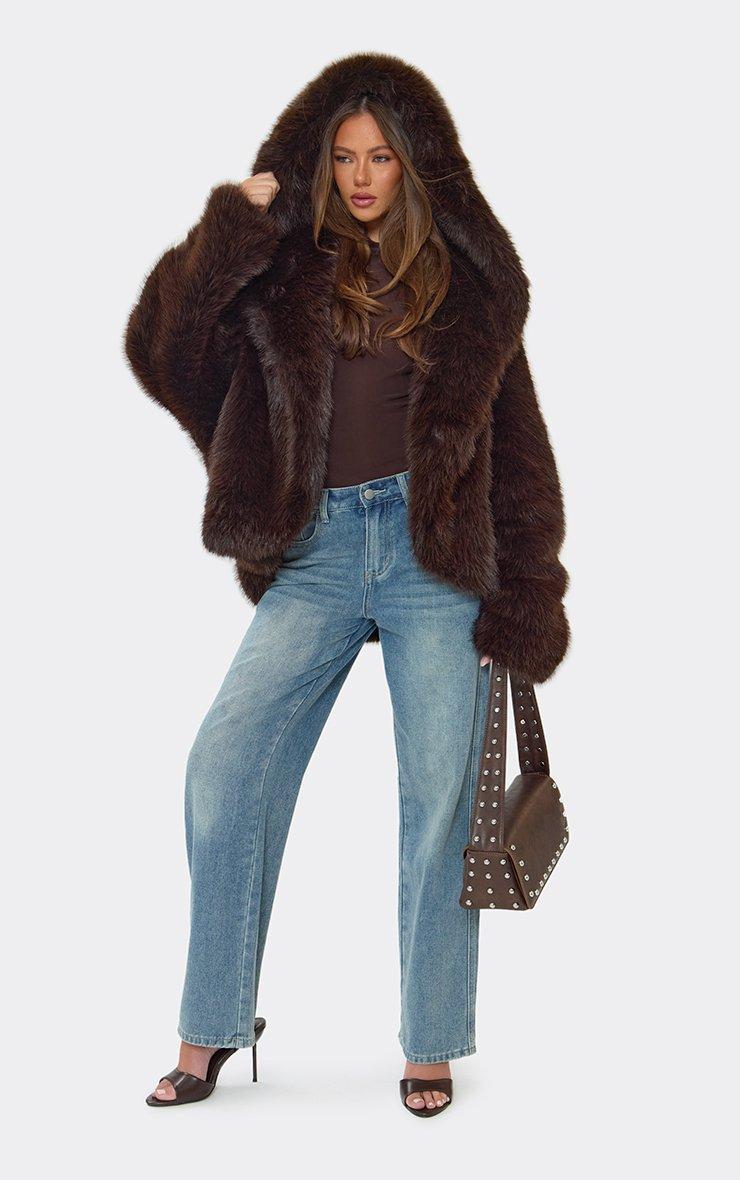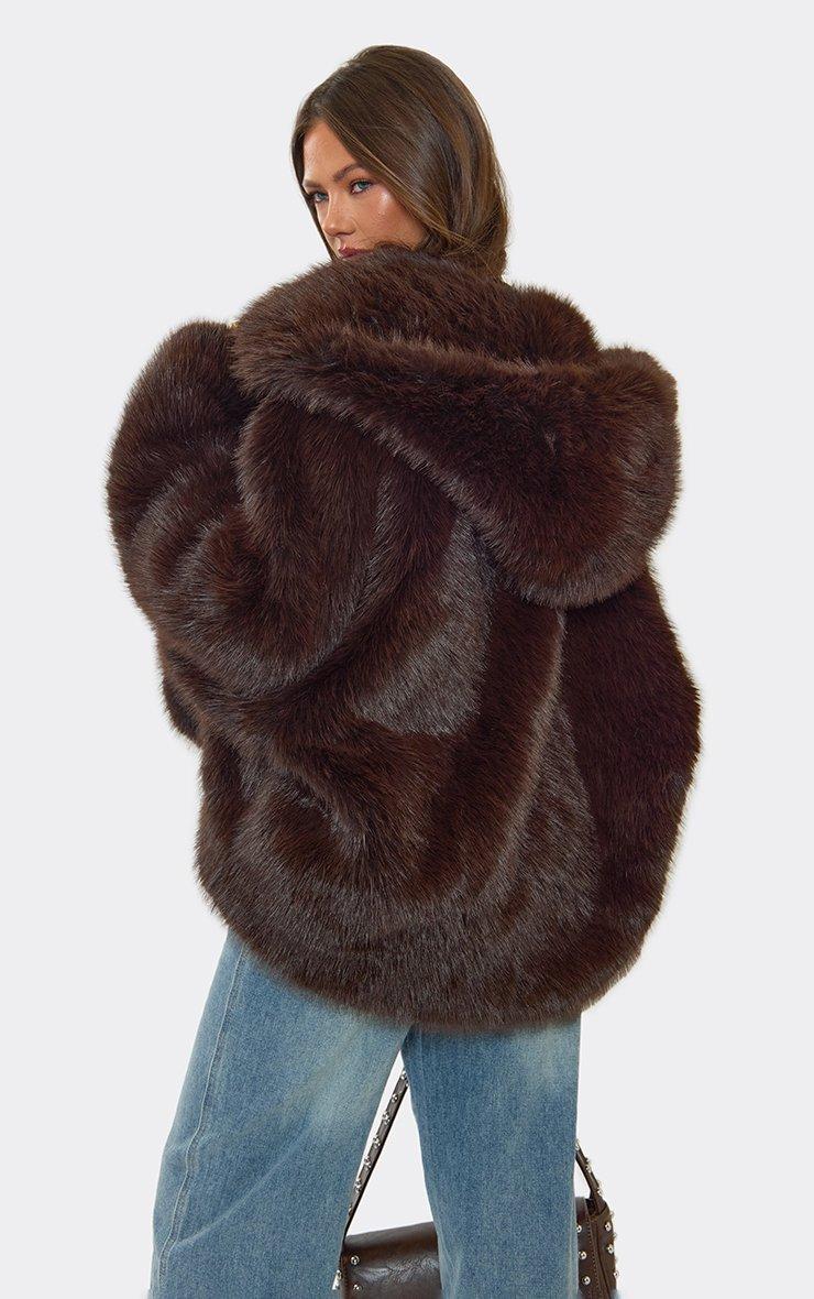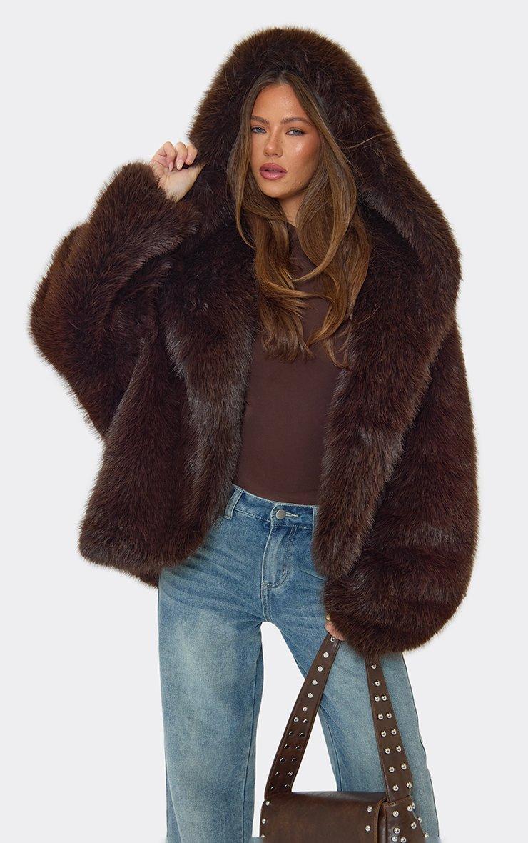 Oversized Hooded Coat In Brown Faux Fur
