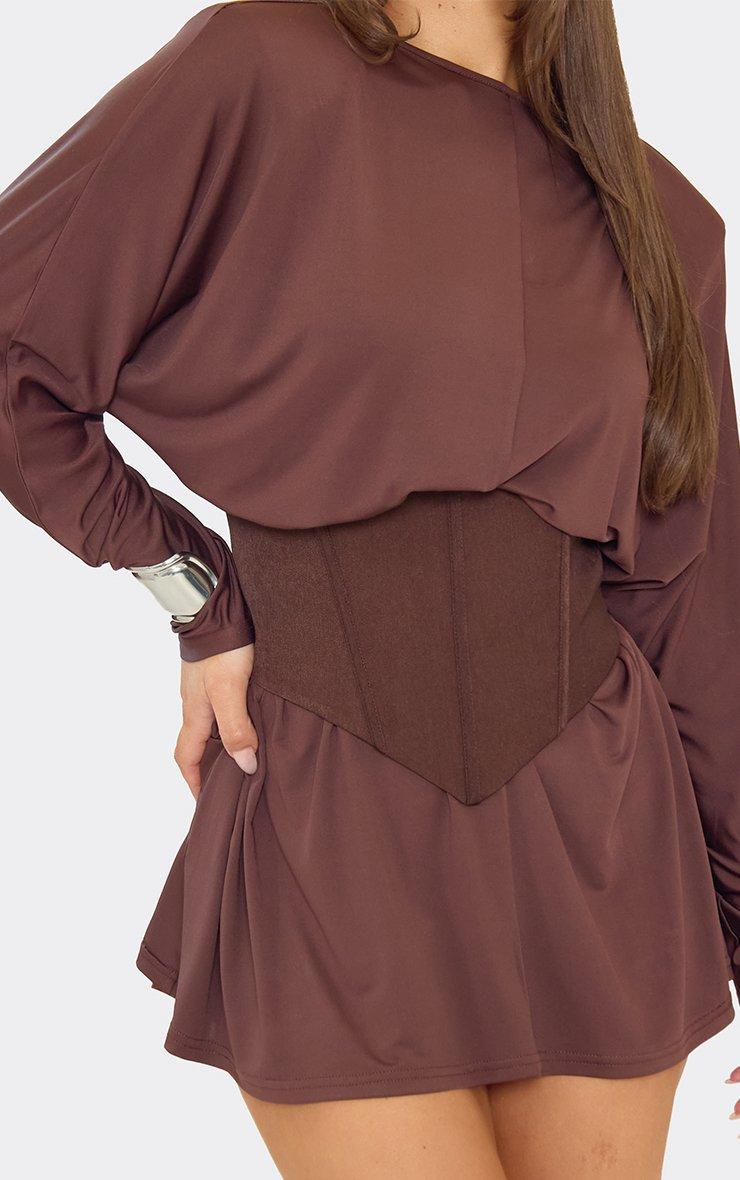 Long Sleeve Corset Detail Skater Dress In Chocolate Brown