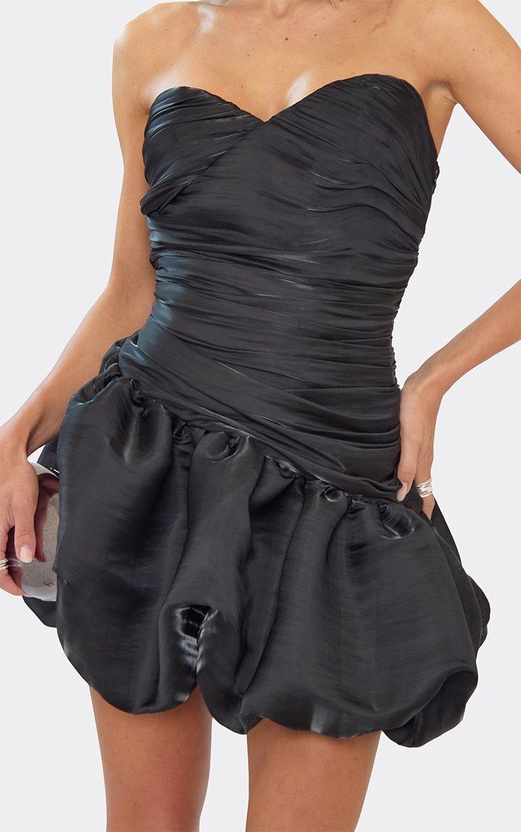 Bandeau Ruched Puffball Mini Dress In Black