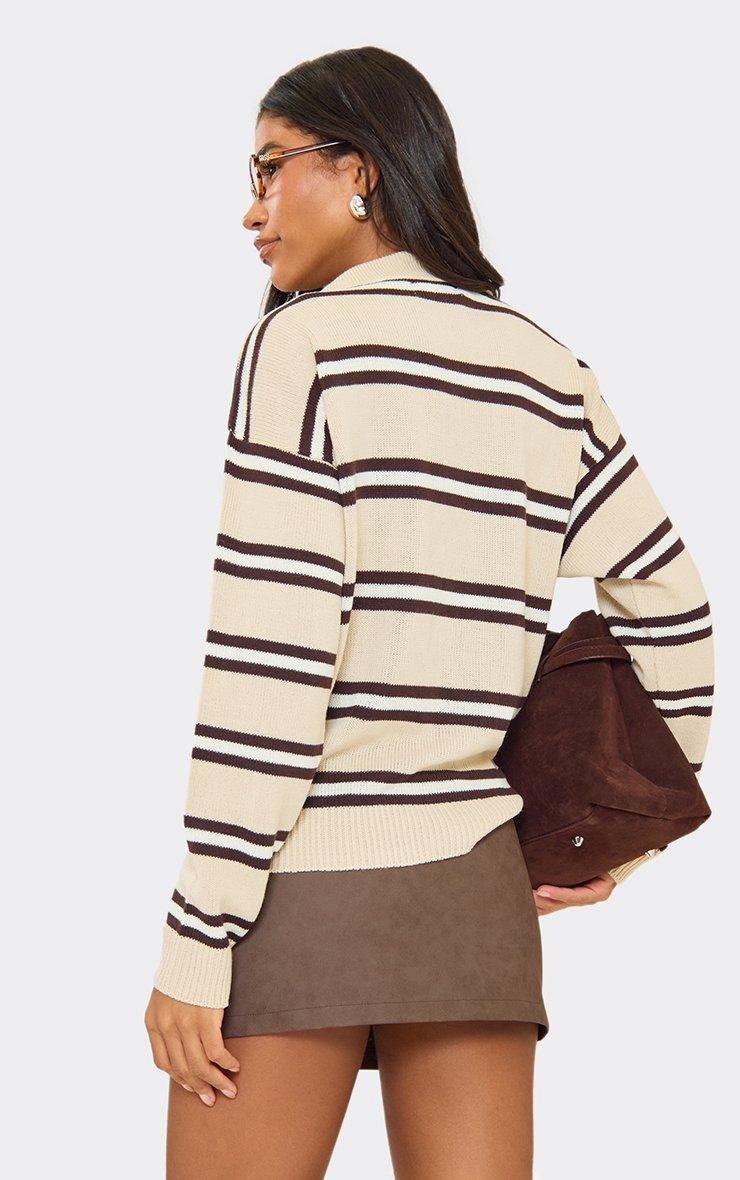 Long Sleeve Polo Collar Detail Rugby Top In Brown Stripe Knit