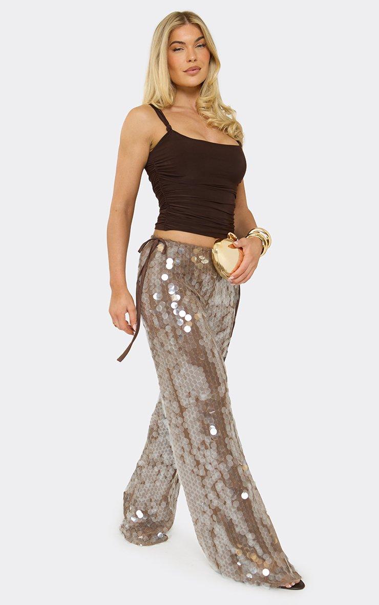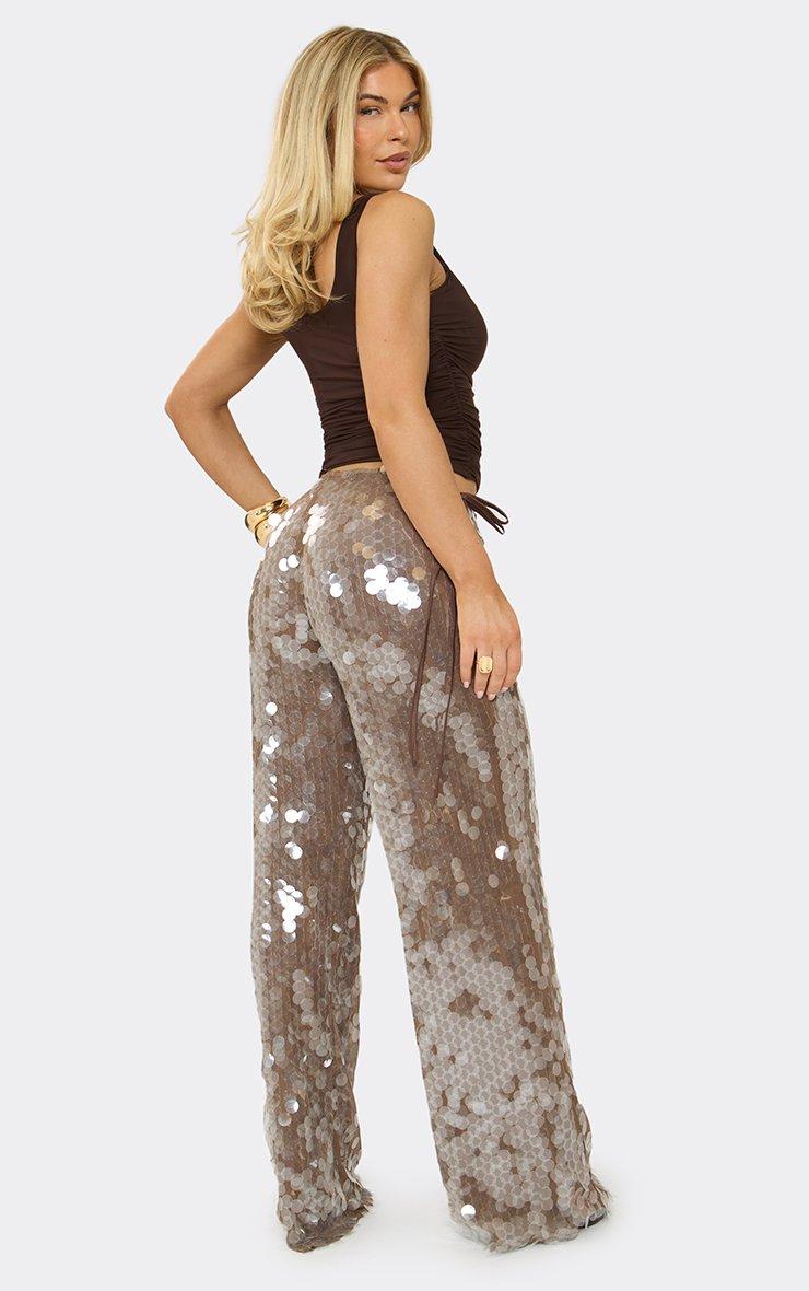 Tie Side Detail Wide Leg Trousers In Nude Disc Sequin
