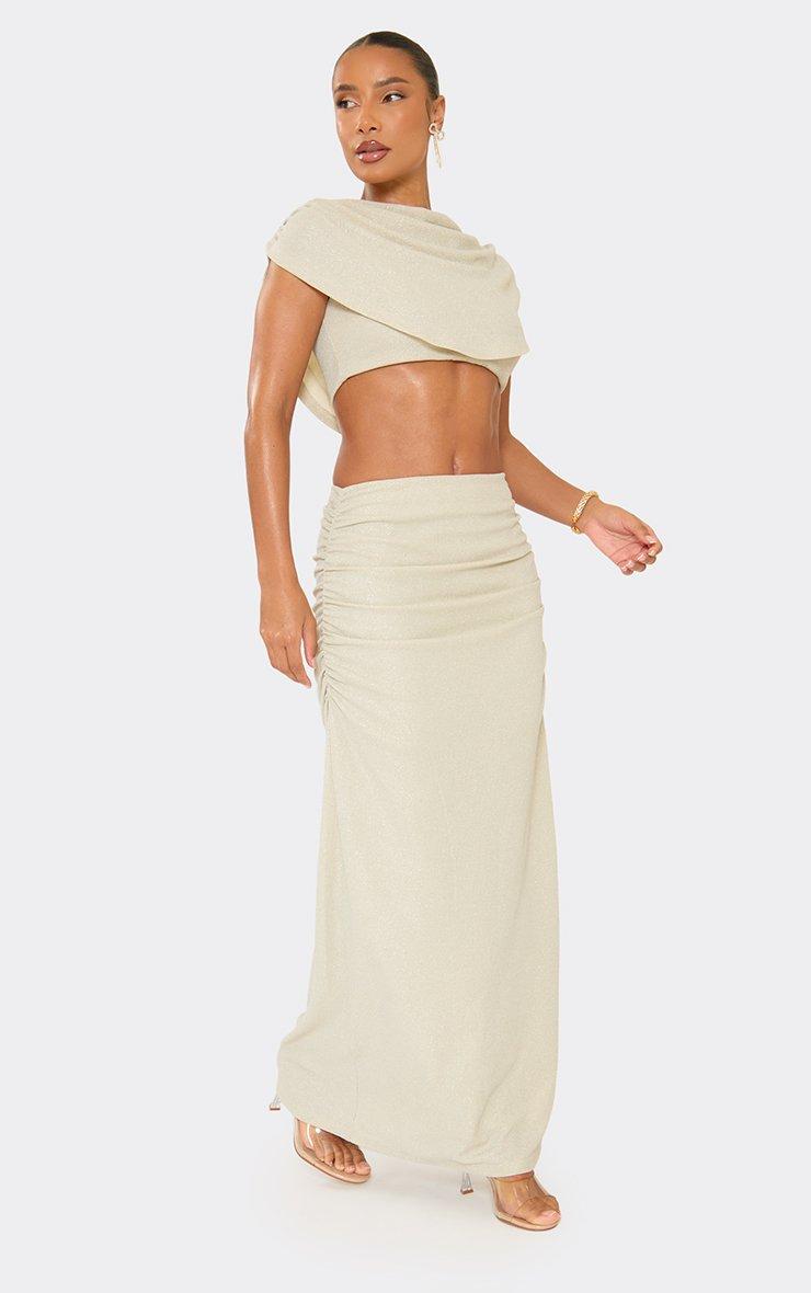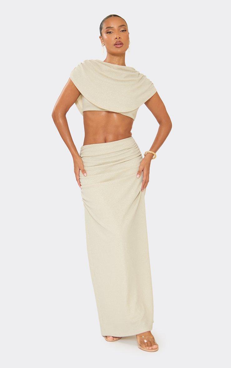 Ruched Drape Cape Crop Top In Champagne Glitter