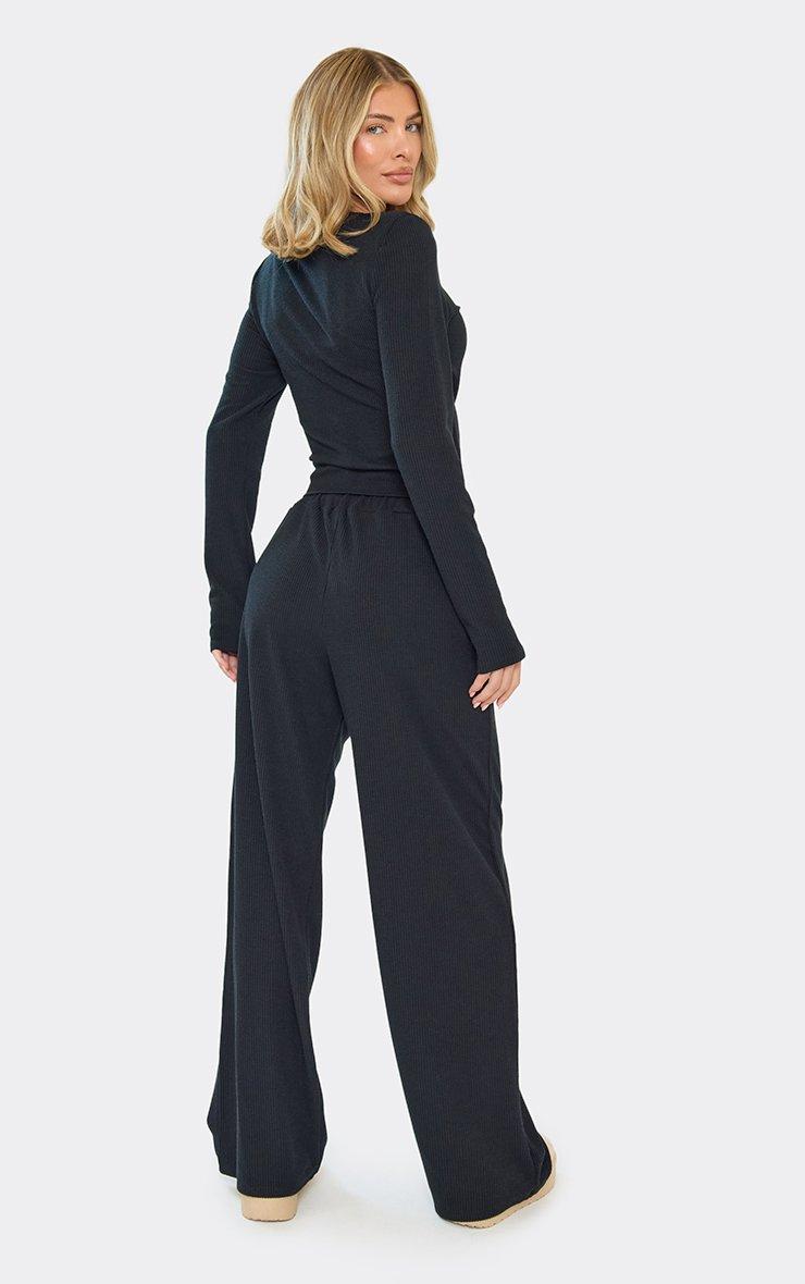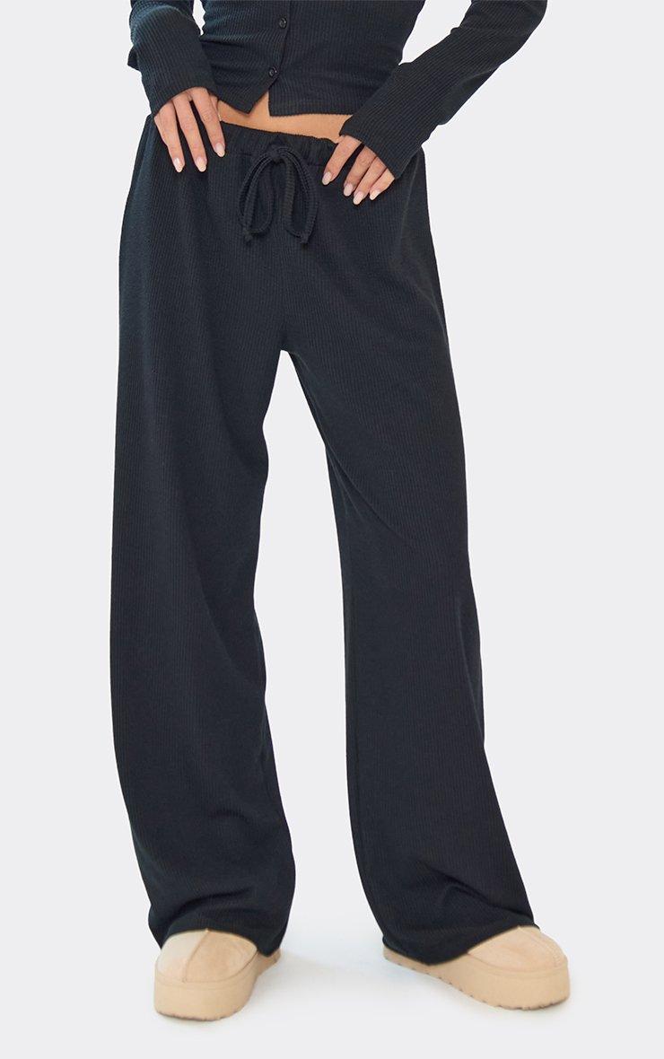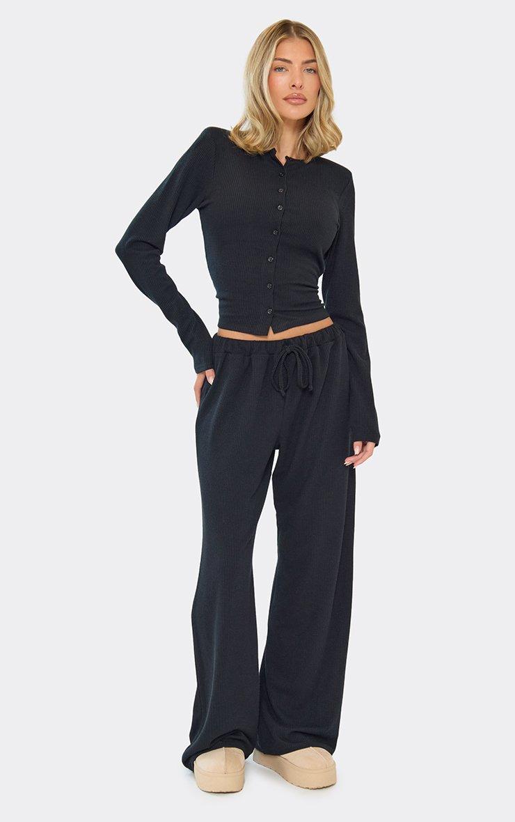 Mid Rise Popper Detail Trousers In Black Ribbed