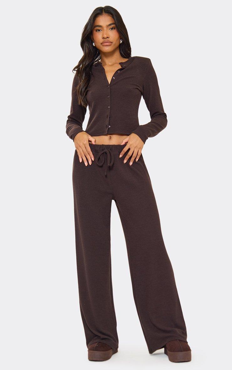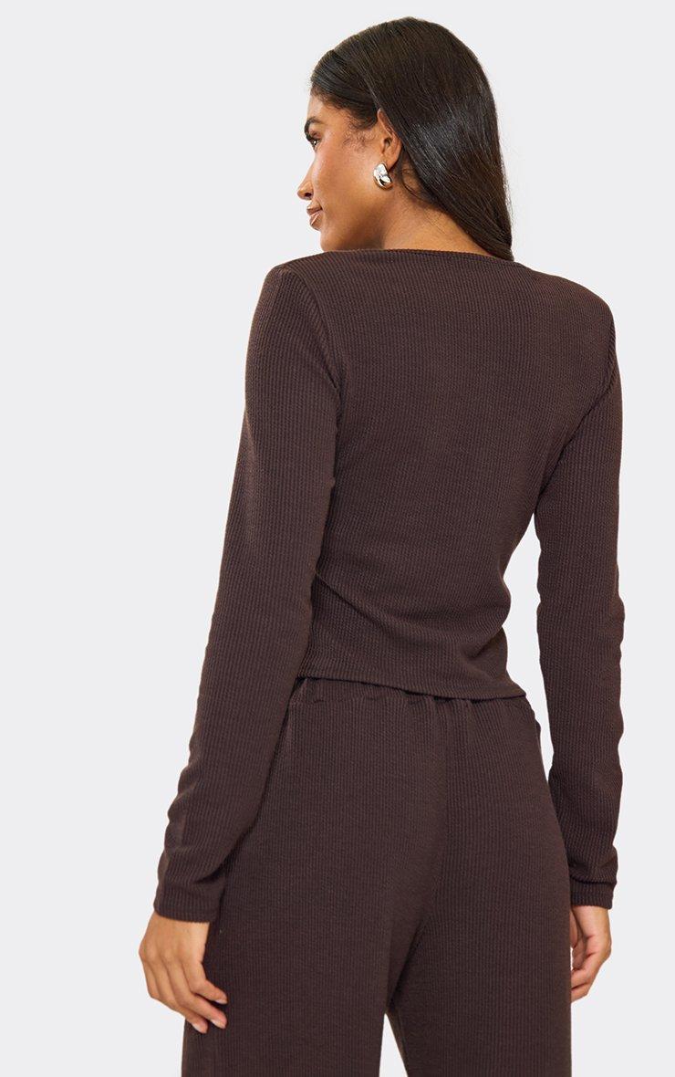 Long Sleeve Button Up Front Fitted Top In Brown Ribbed