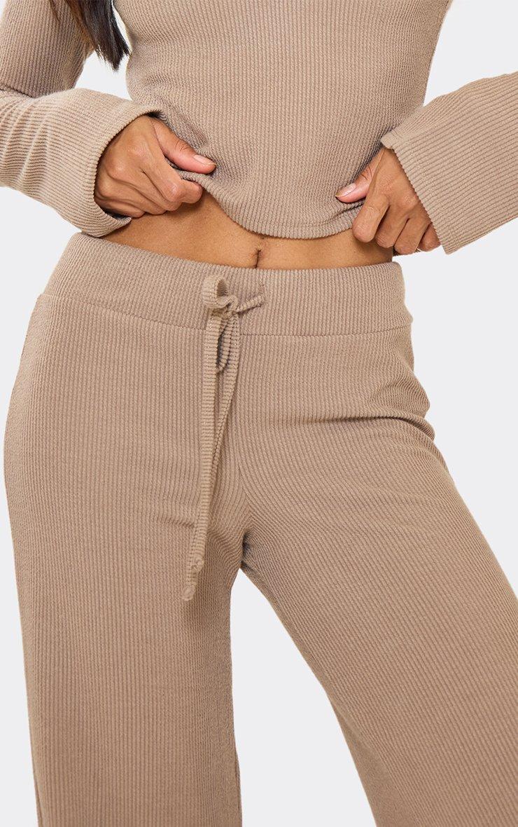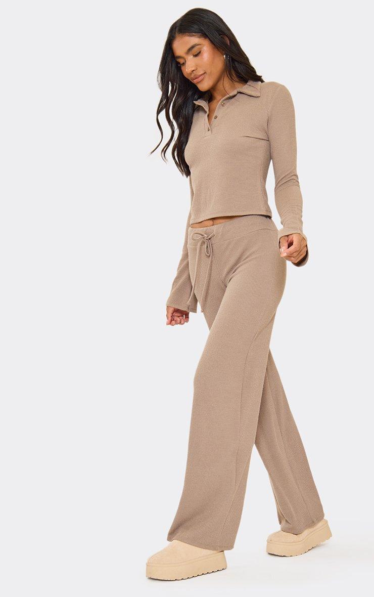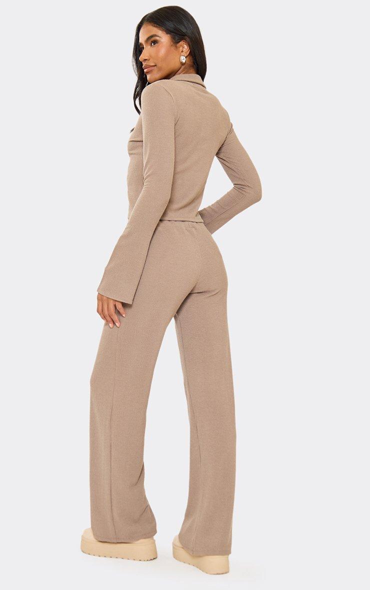 Low Rise Wide Leg Trousers In Chocolate Brown Ribbed