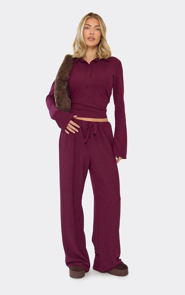 Long Flared Sleeve Polo Top In Burgundy Ribbed