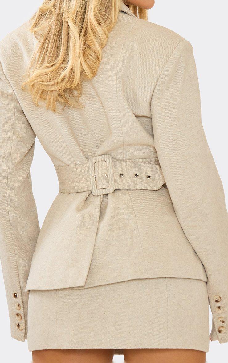 Shoulder Padded Cinched Waist Wool Look Detail Blazer In Beige