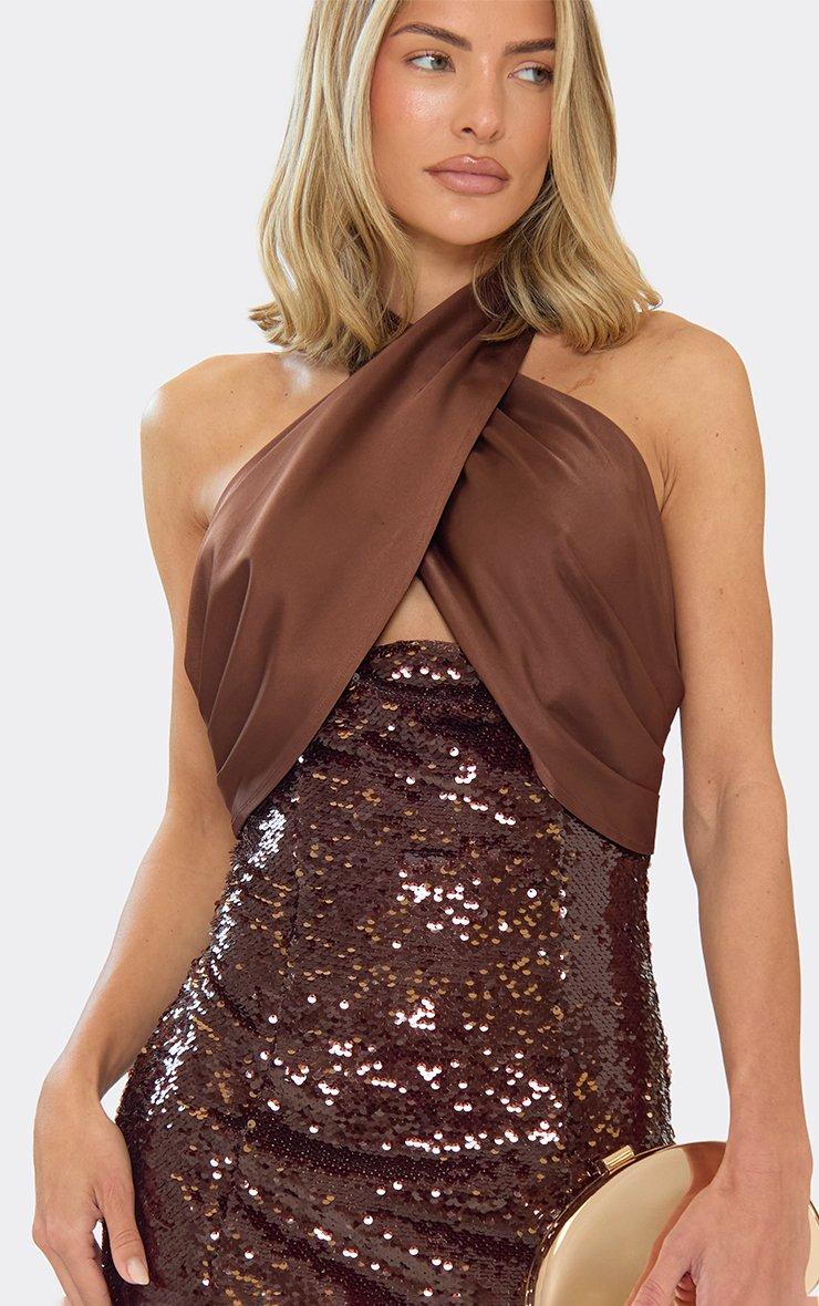 Contrast Crossover Strap Mini Dress In Chocolate Brown Sequin