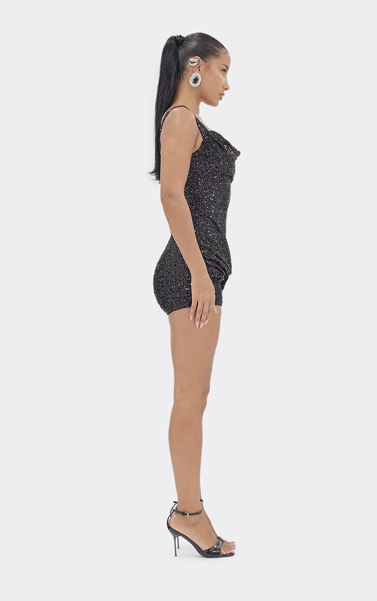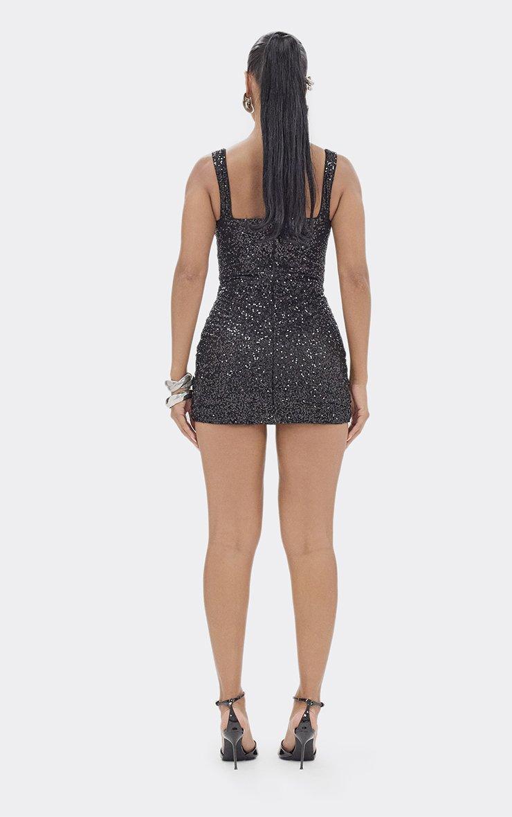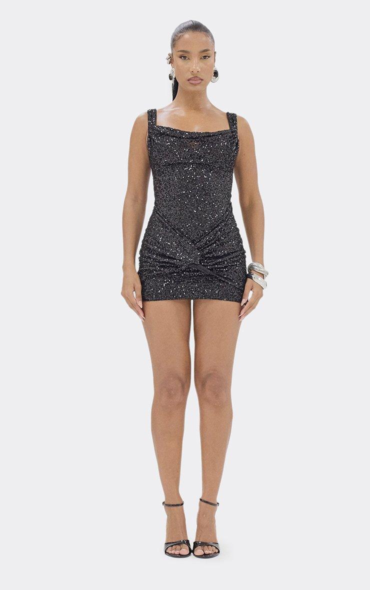Square Neck Knot Front Detail Mini Dress In Black Sequin