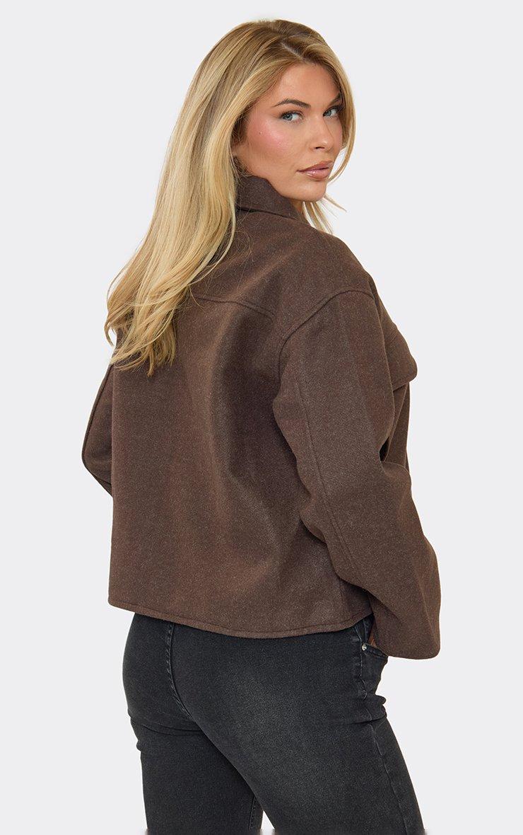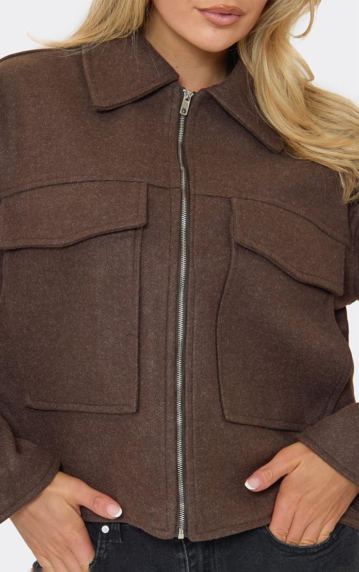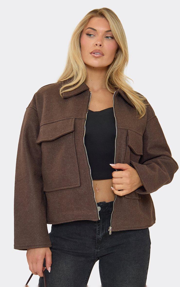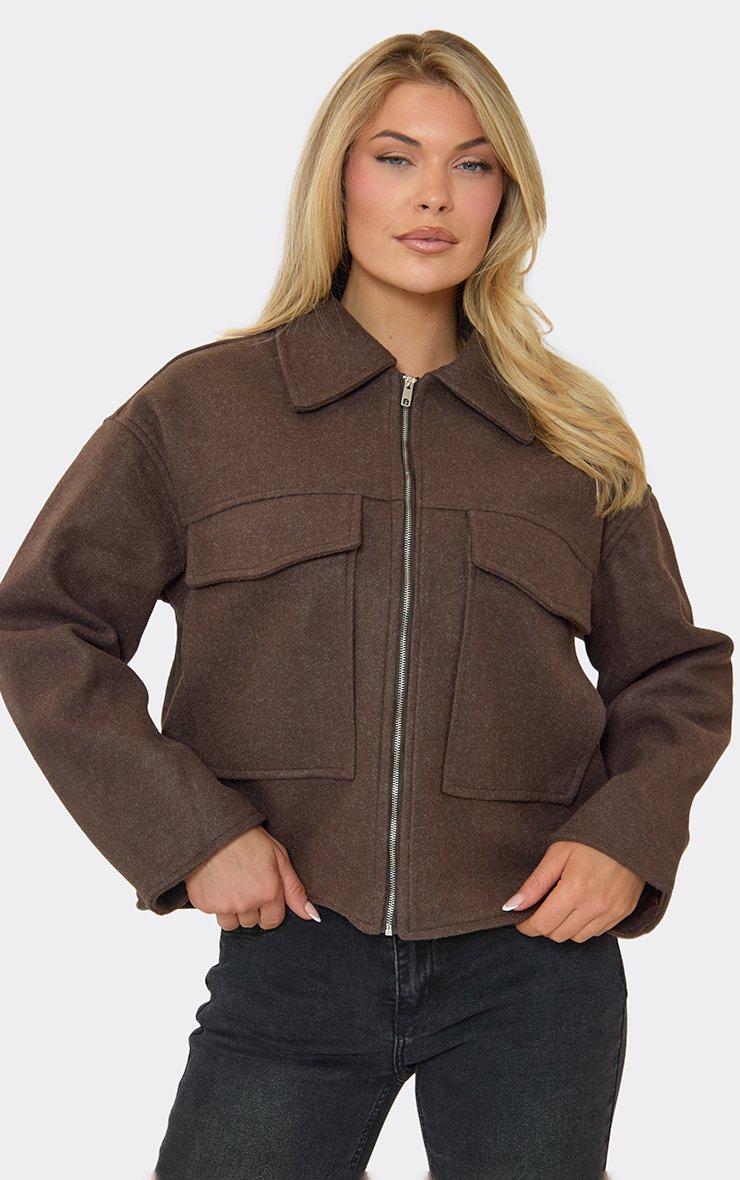 Collared Zip Up Boxy Wool Look Jacket In Chocolate Brown