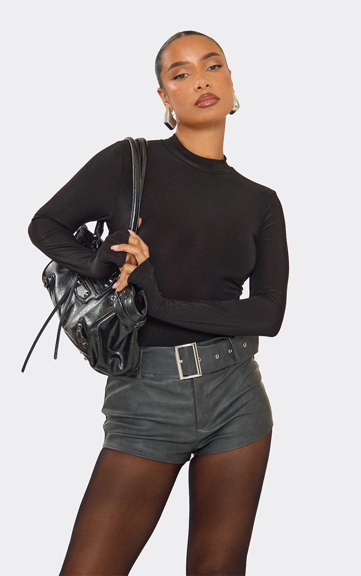 High Rise Belted Shorts In Grey Faux Leather