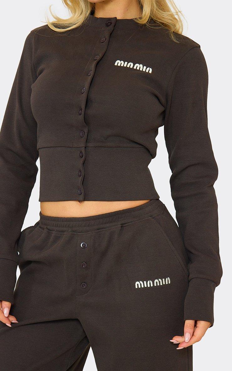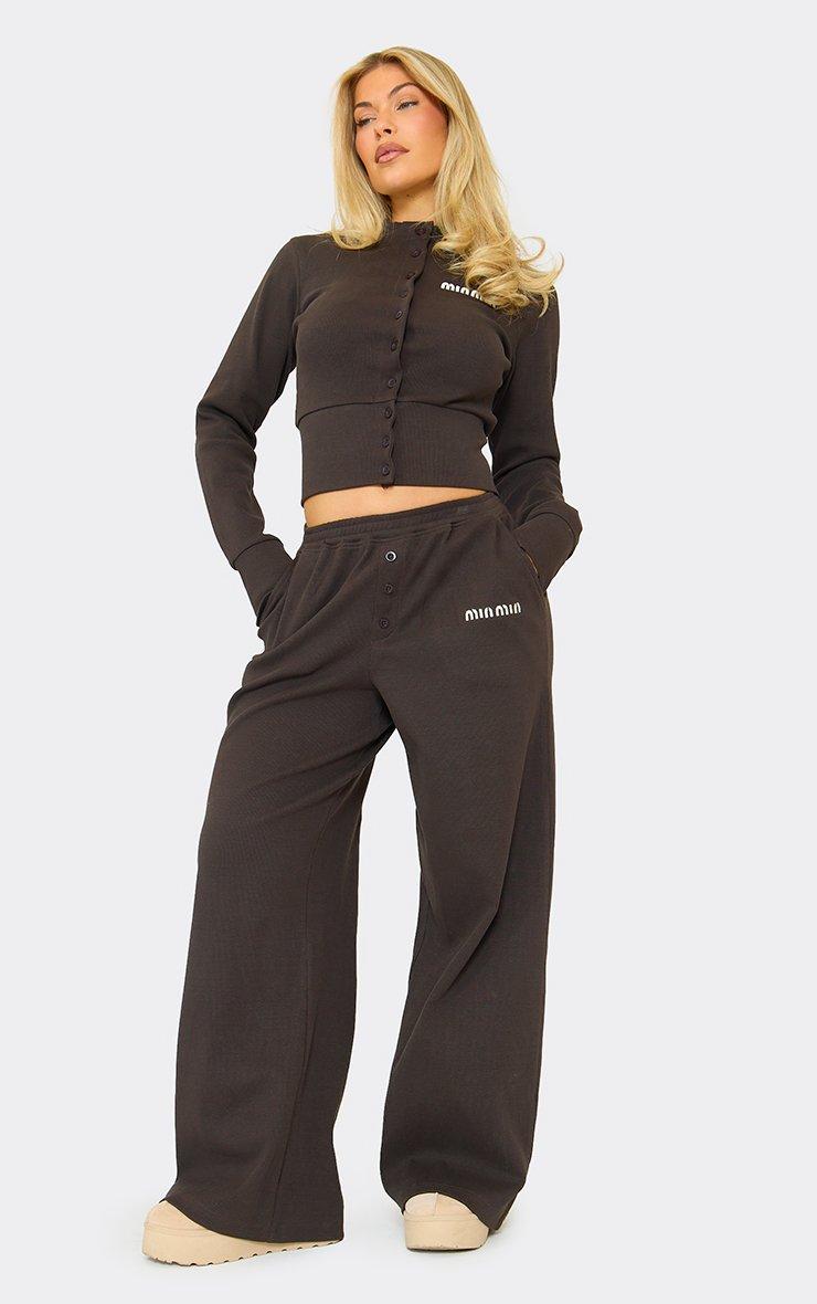 Low Rise Wide Leg Embroidered Min Min Graphic Joggers In Chocolate Brown Ribbed