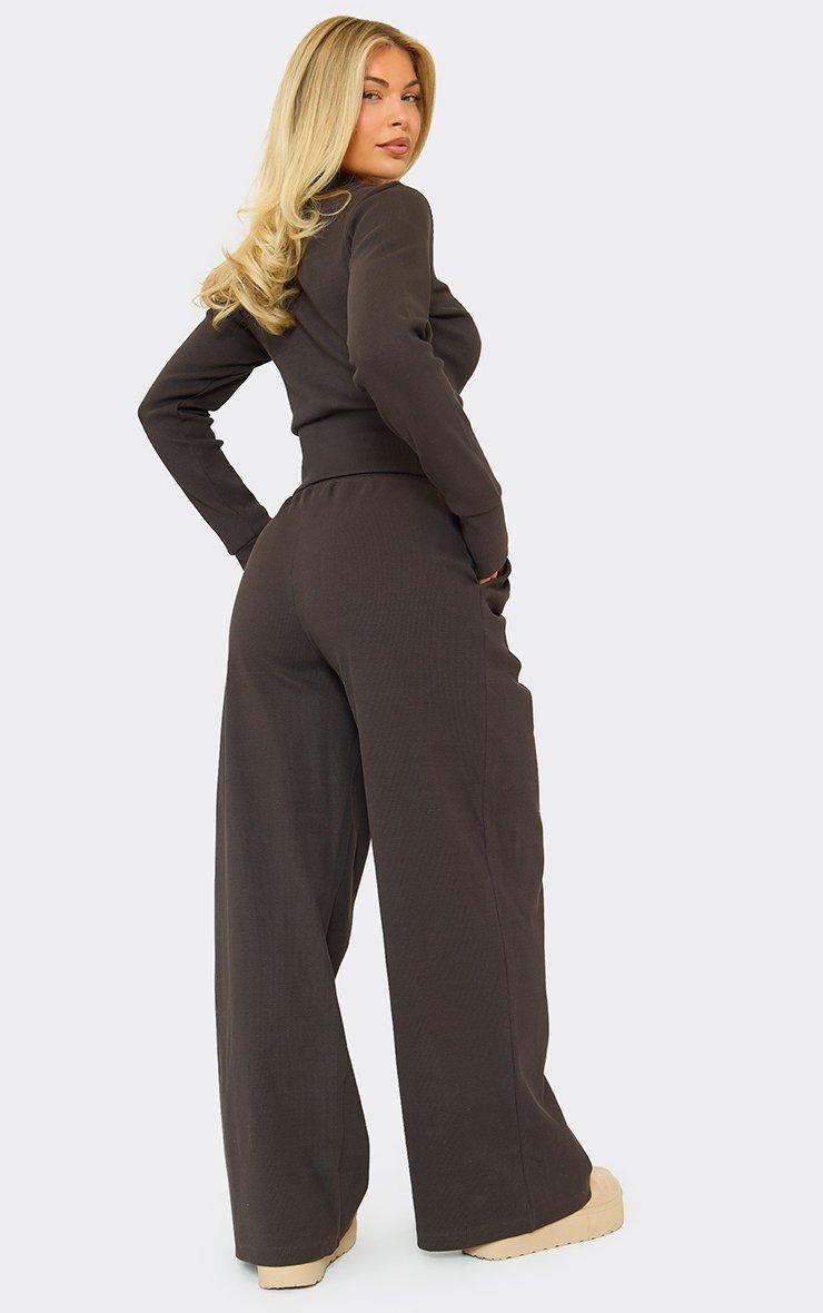 Mid Rise Wide Leg Trousers In Chocolate Brown Ribbed