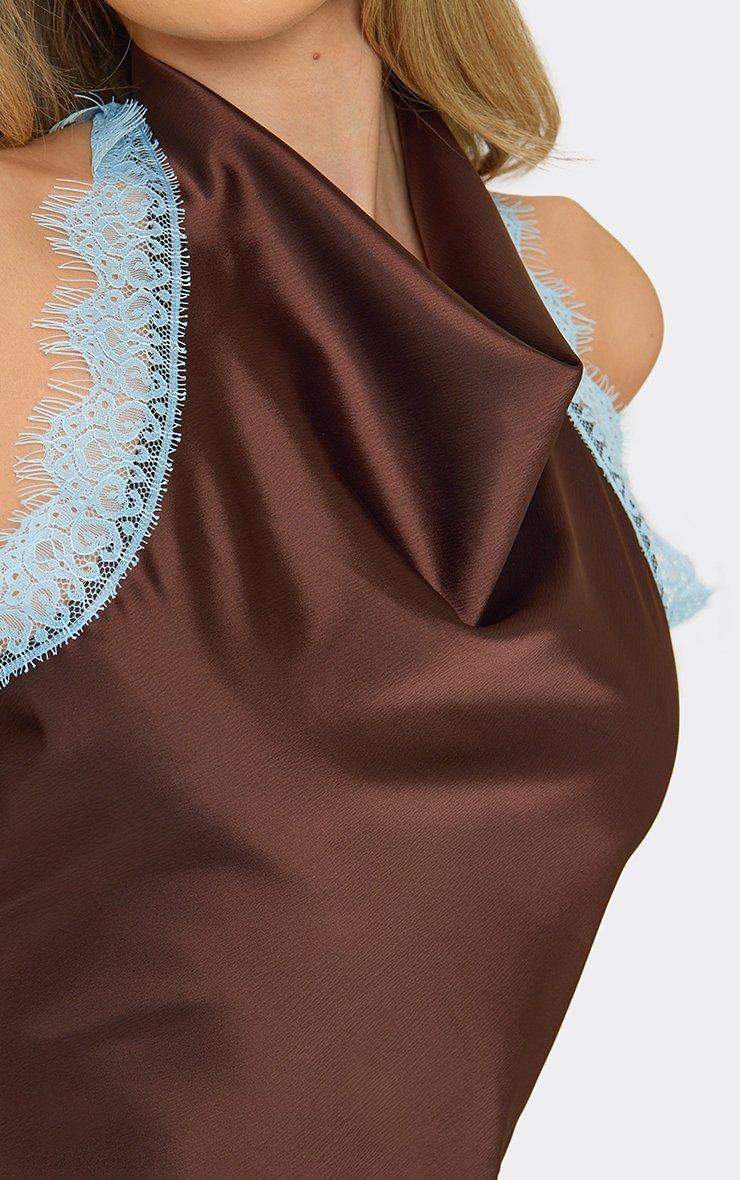 cowl high neck lace trim asymmetric hem detail mini dress in brown satin