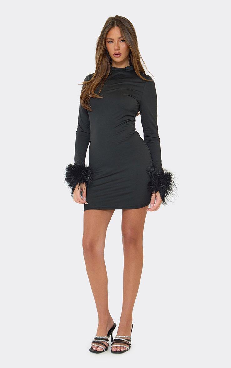 Long Sleeve High Neck Feather Cuff Mini Dress In Black