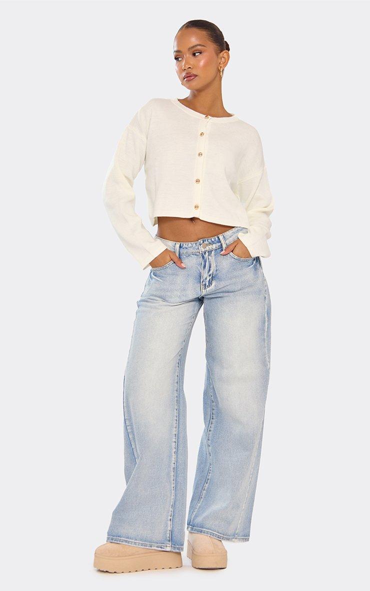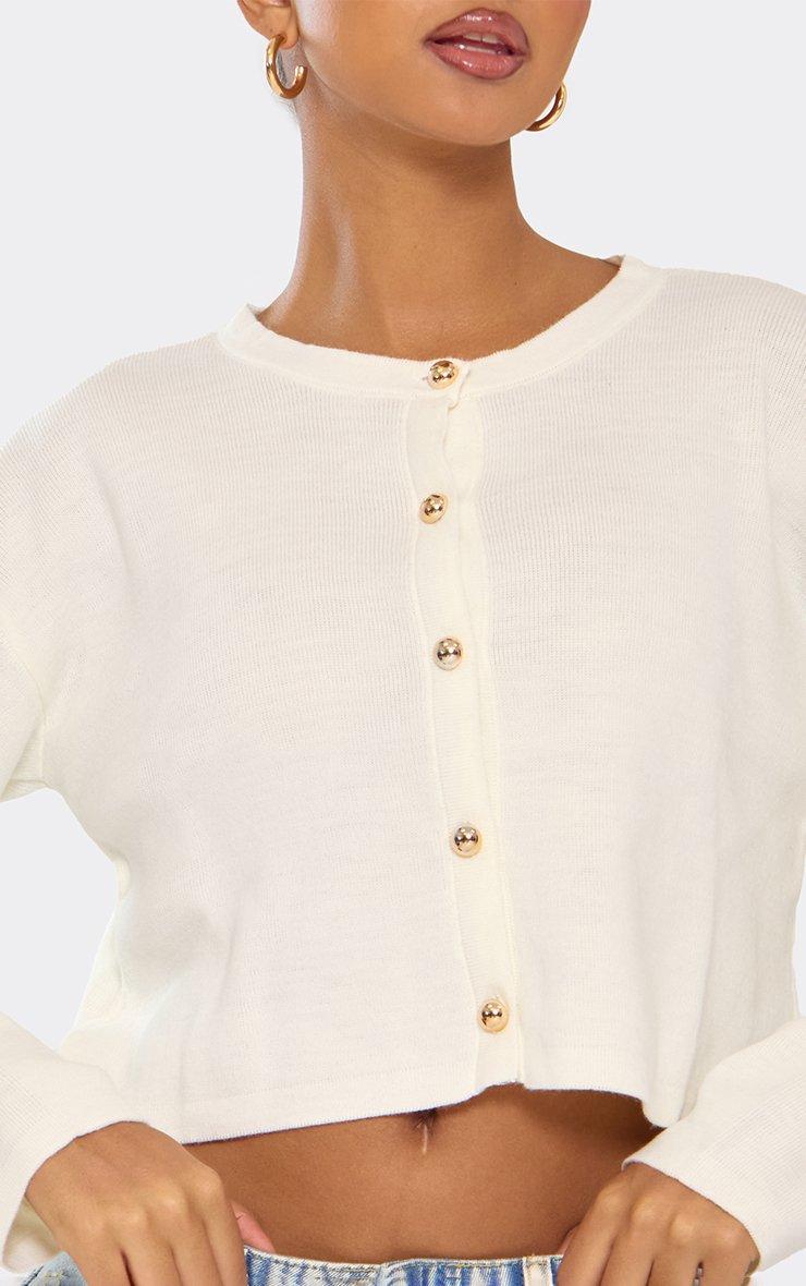 Long Sleeve Wrap Front Button Detail Cardigan In Cream Knit