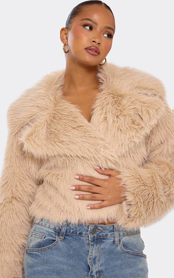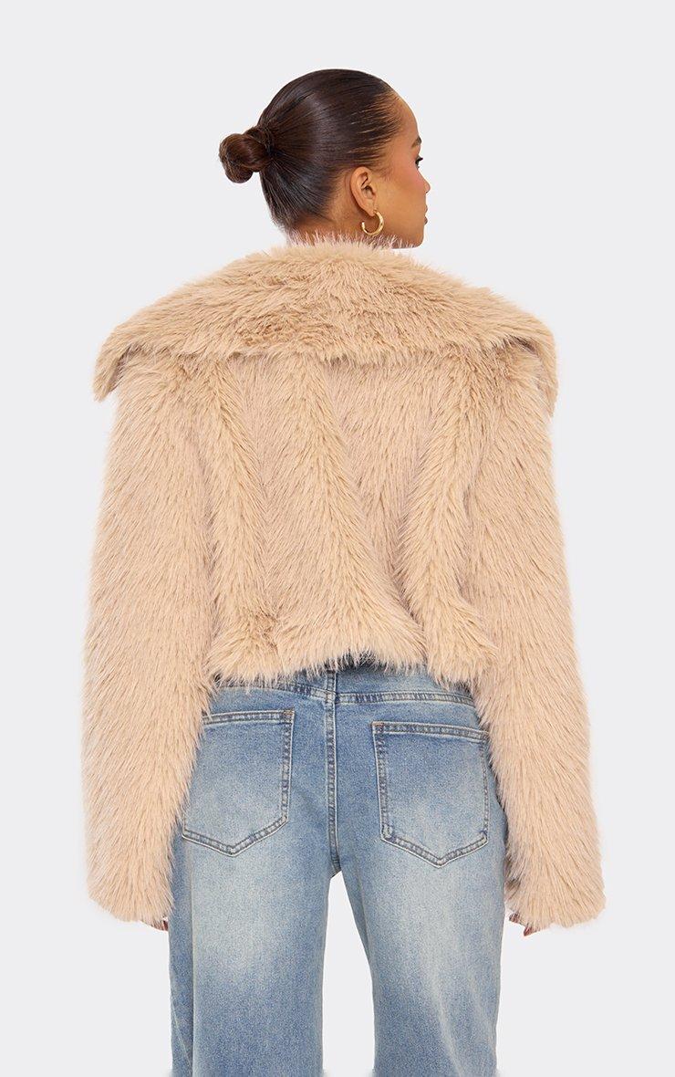 Long Sleeve Oversized Collar Detail Coat In Beige Faux Fur