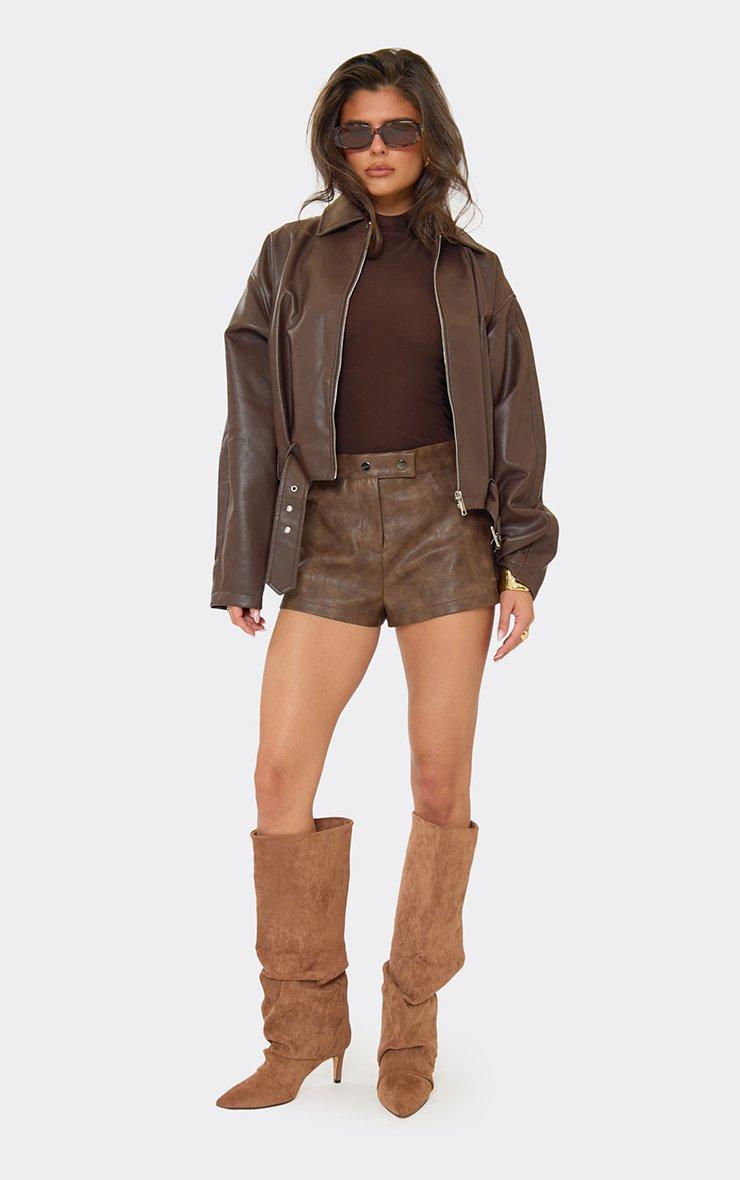 Mid Rise Belt Loop Detail Shorts In Chocolate Brown Faux Leather