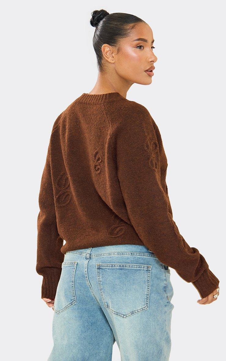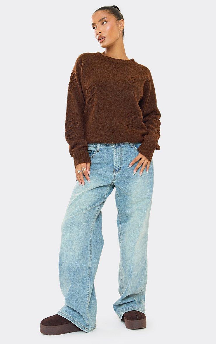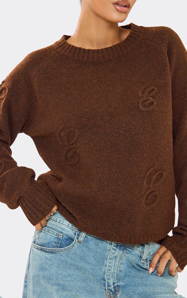 Long Sleeve 'E' Graphic Applique Detail Oversized Jumper In Chocolate Brown Knit