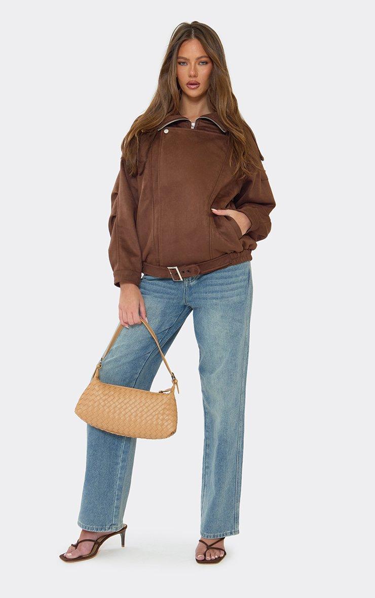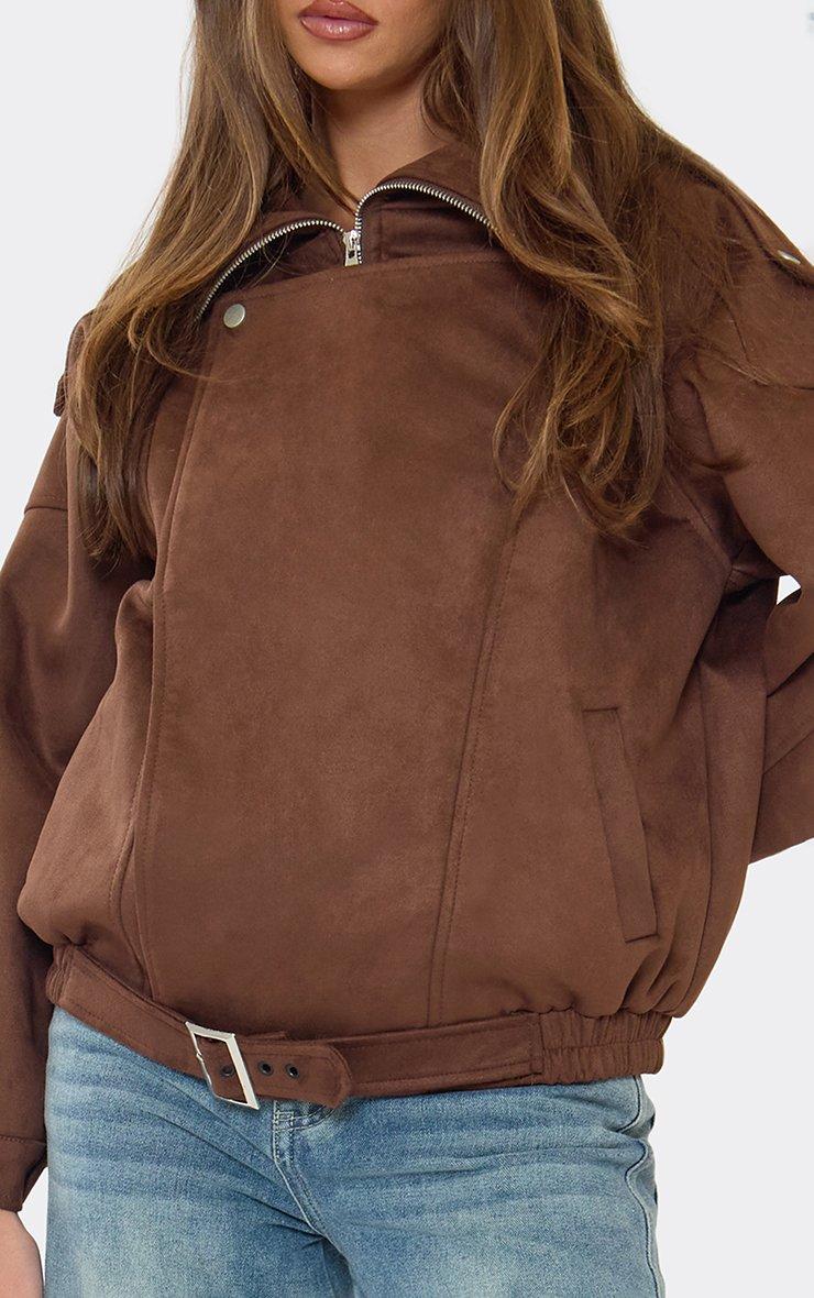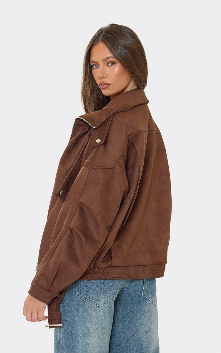 High Neck Zip Detail Bomber Jacket In Chocolate Brown Faux Suede