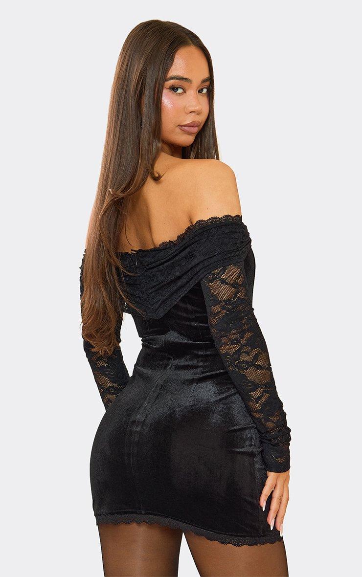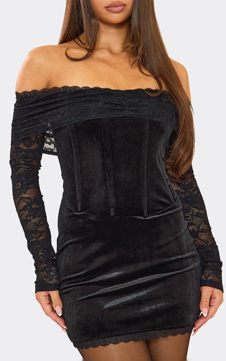bardot fold over contrast lace corset detail mini dress in black velvet