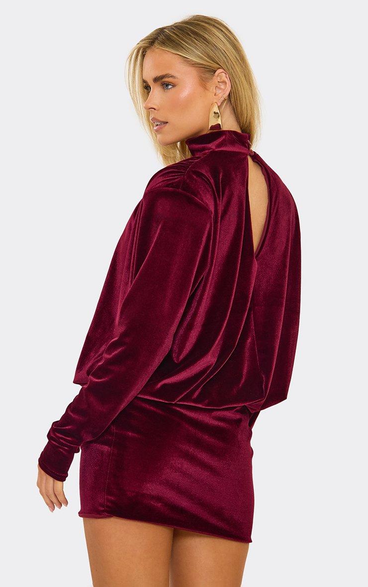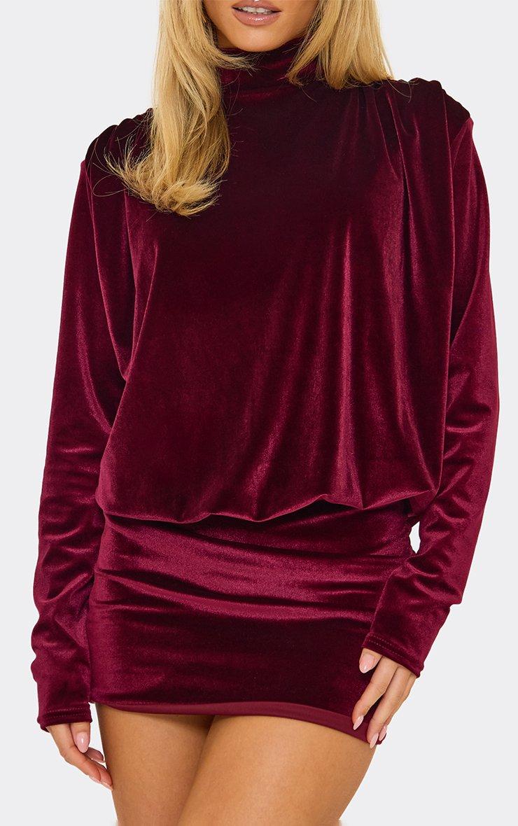 high neck shoulder pad long sleeve blouson detail mini dress in burgundy