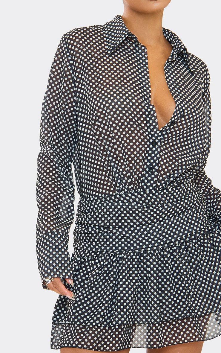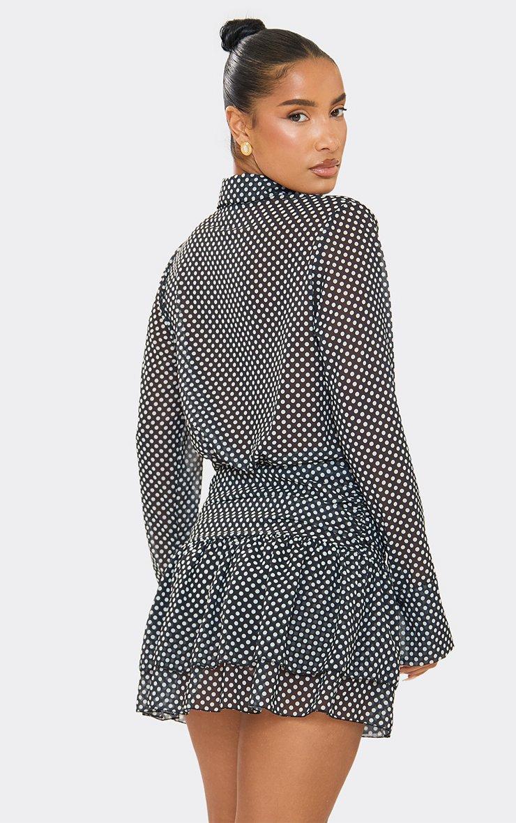 Long Sleeve Frill Hem Shirt Dress In Black Polka Dot