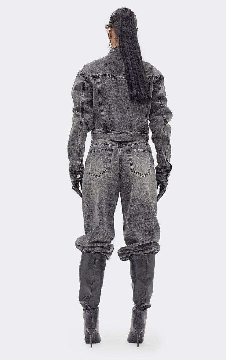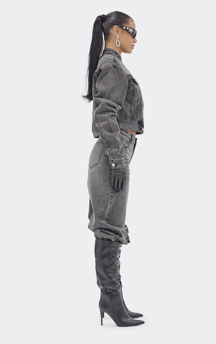High Neck Asymmetric Button Detail Jacket In Washed Grey Denim
