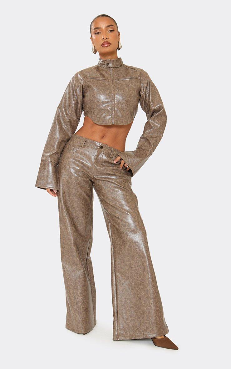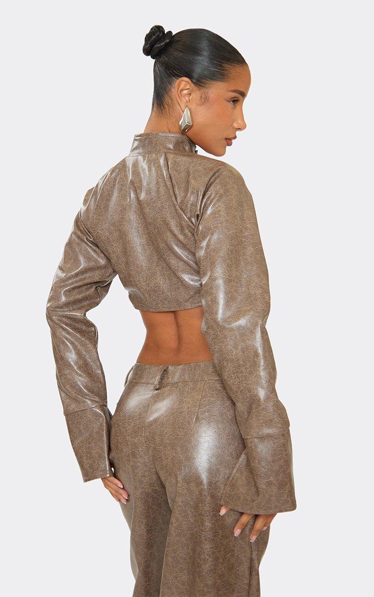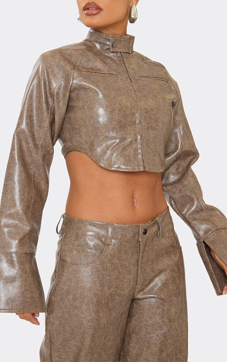 Long Sleeve Fitted Zip Up Cropped Jacket In Brown Faux Leather