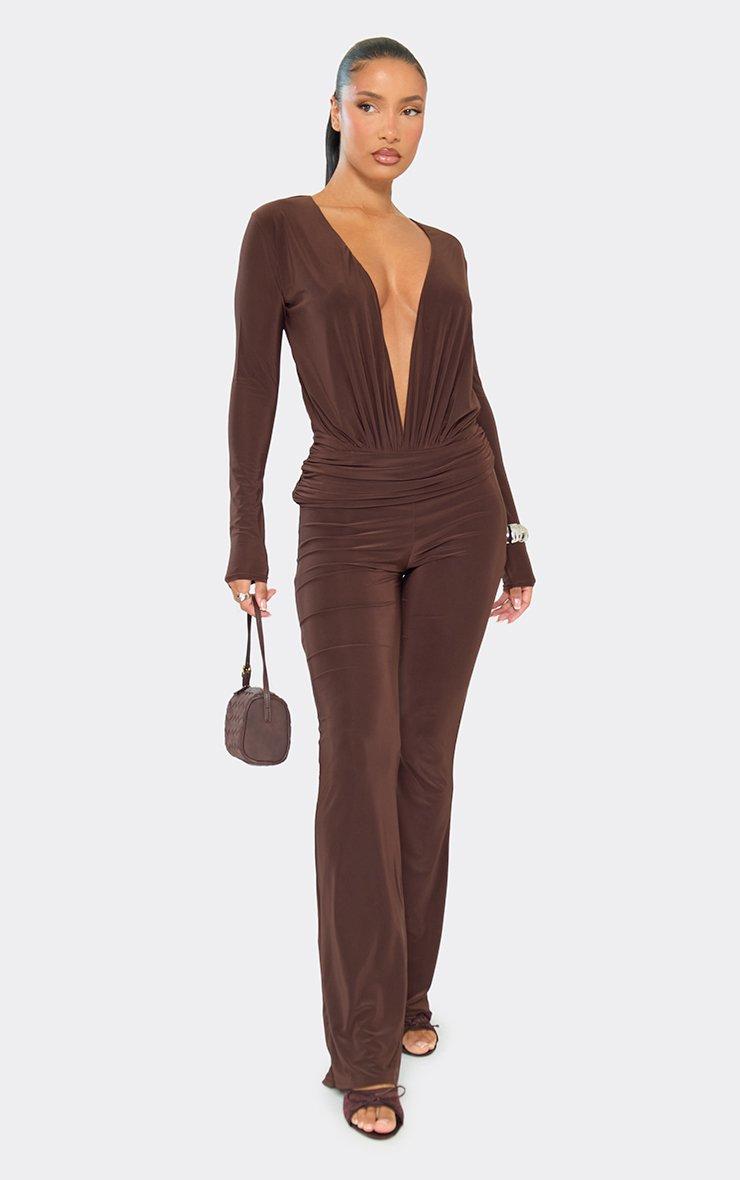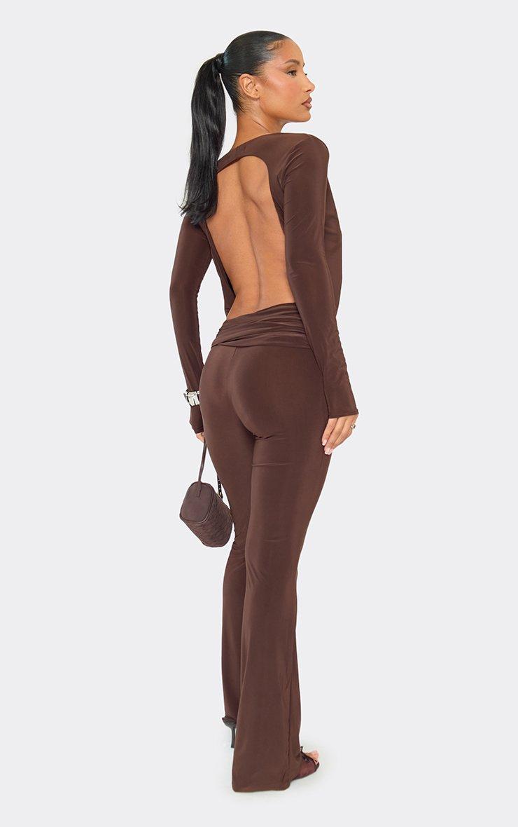 Low Rise Ruched Trim Detail Flared Trousers In Chocolate Brown Mesh