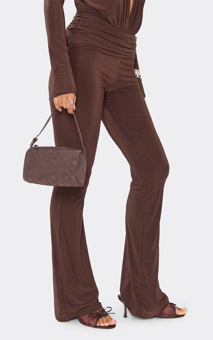 Fold Over Ruched Skinny Flared Leg Trousers In Chocolate Brown