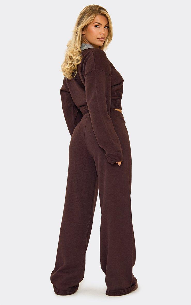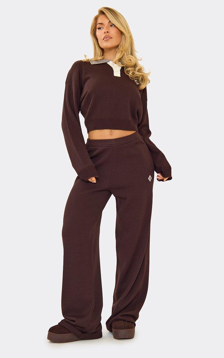 Mid Rise Ego Logo Wide Leg Trousers In Chocolate Brown Knit