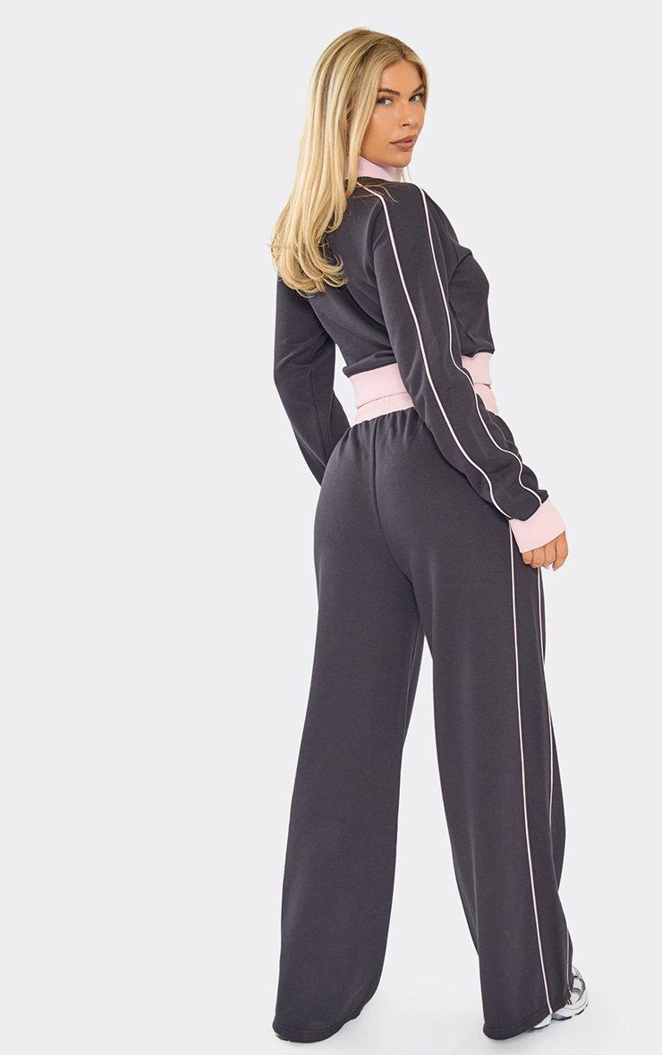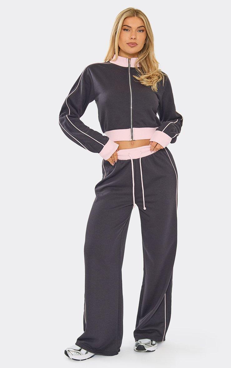 Mid Rise Contrast Piping Detail Wide Leg Joggers In Navy