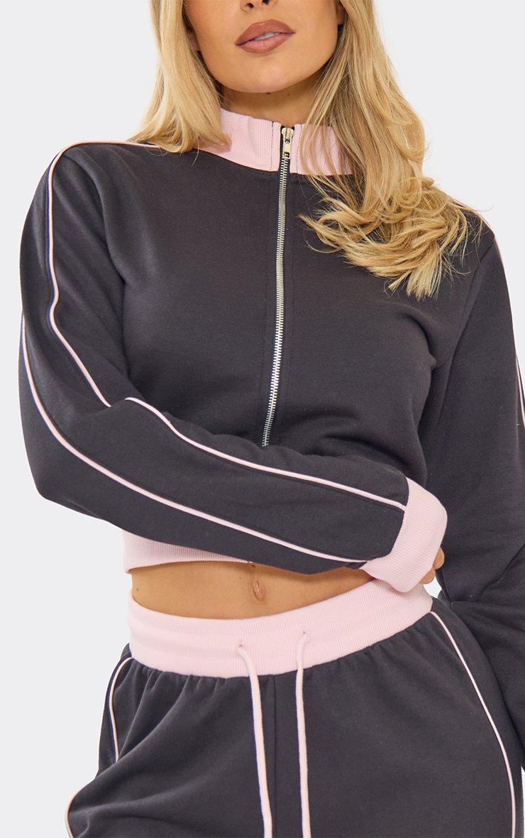 High Neck Contrast Pink Fitted Zip Up Sweatshirt In Navy