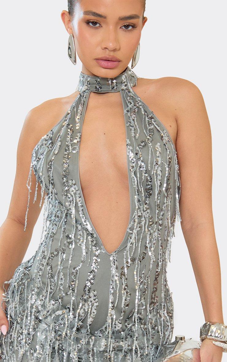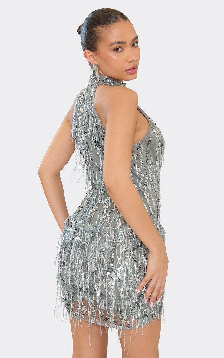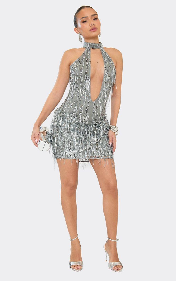 High Neck Plunge Front Mini Dress In Silver Tassel Sequin