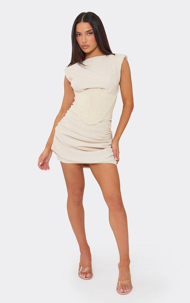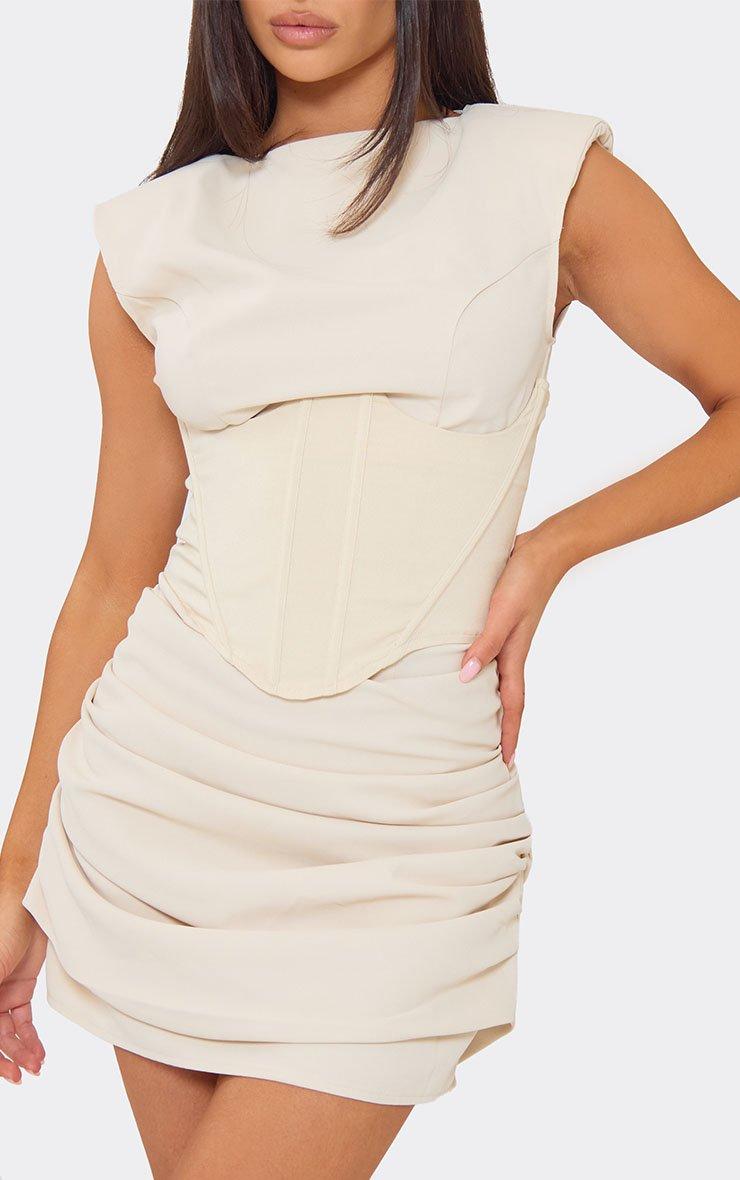 shoulder pad corset drape detail mini dress in cream