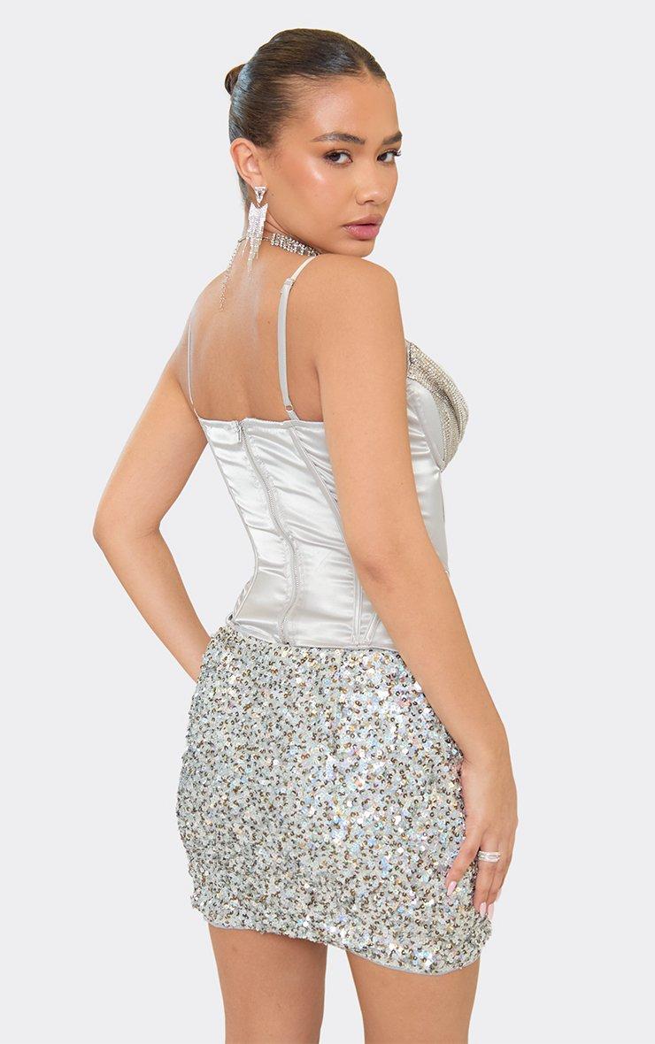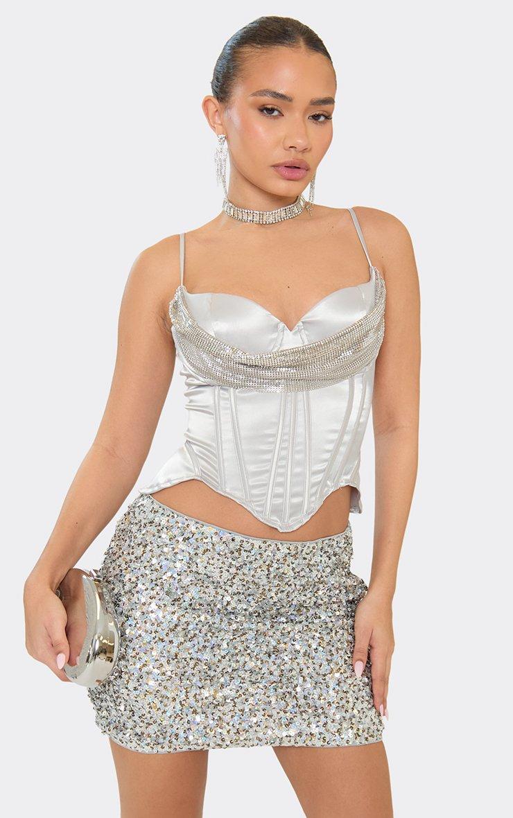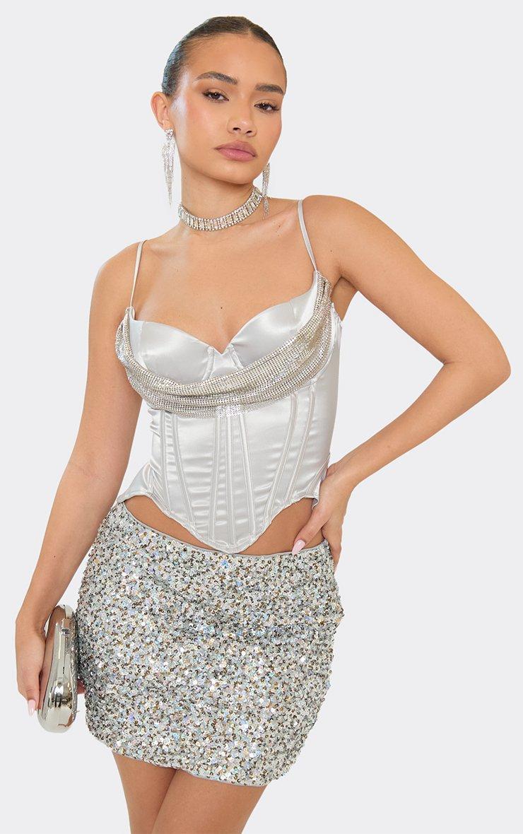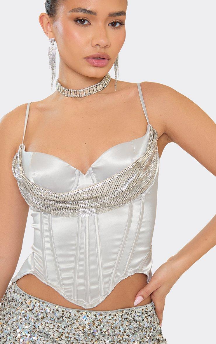 Strappy Chainmail Drape Detail Corset In Silver Satin