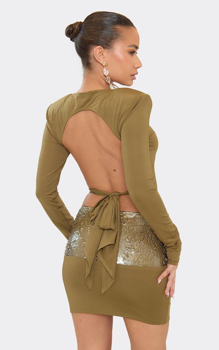 Long Sleeve Shoulder Pad Open Back Top In Khaki