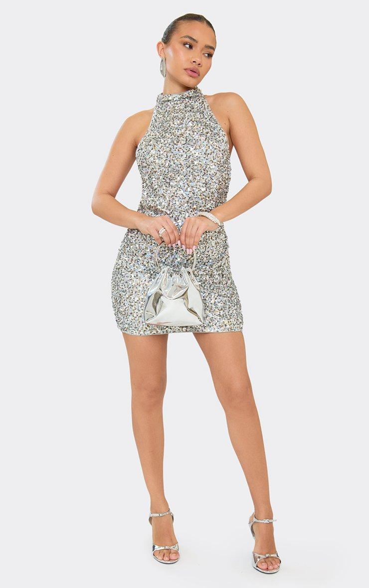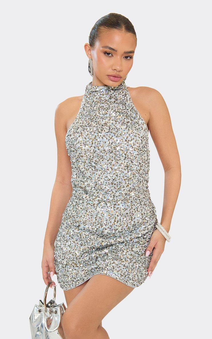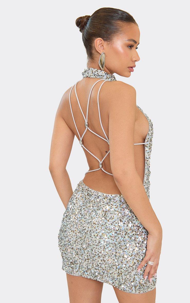High Neck Lace Up Back Detail Mini Dress In Silver Sequin