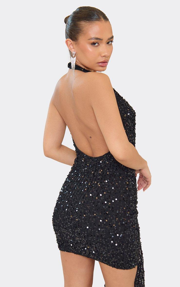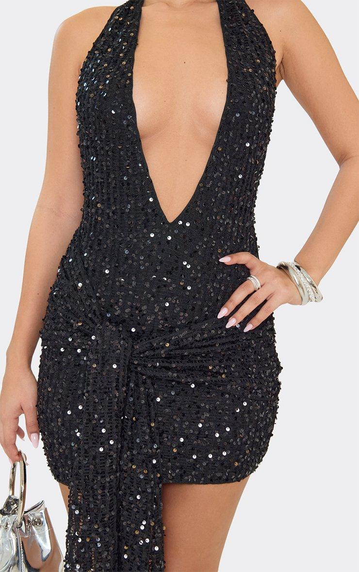 Plunge Halterneck Drape Detail Mini Dress In Black Velvet Sequin