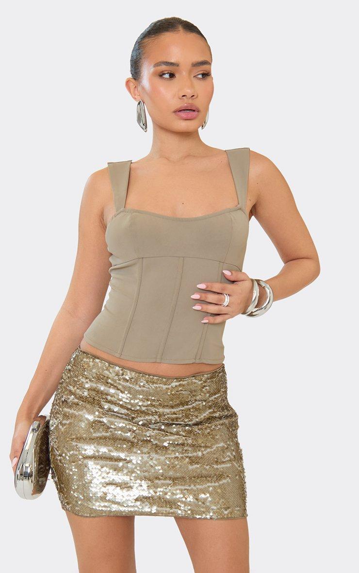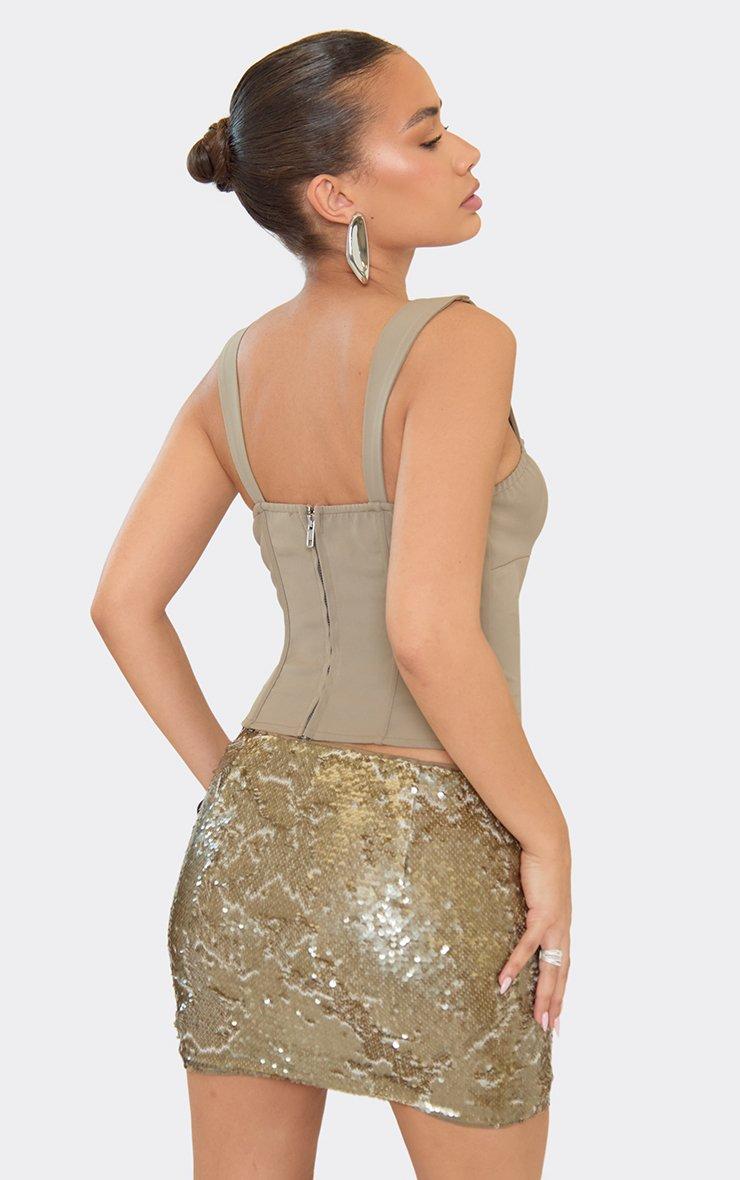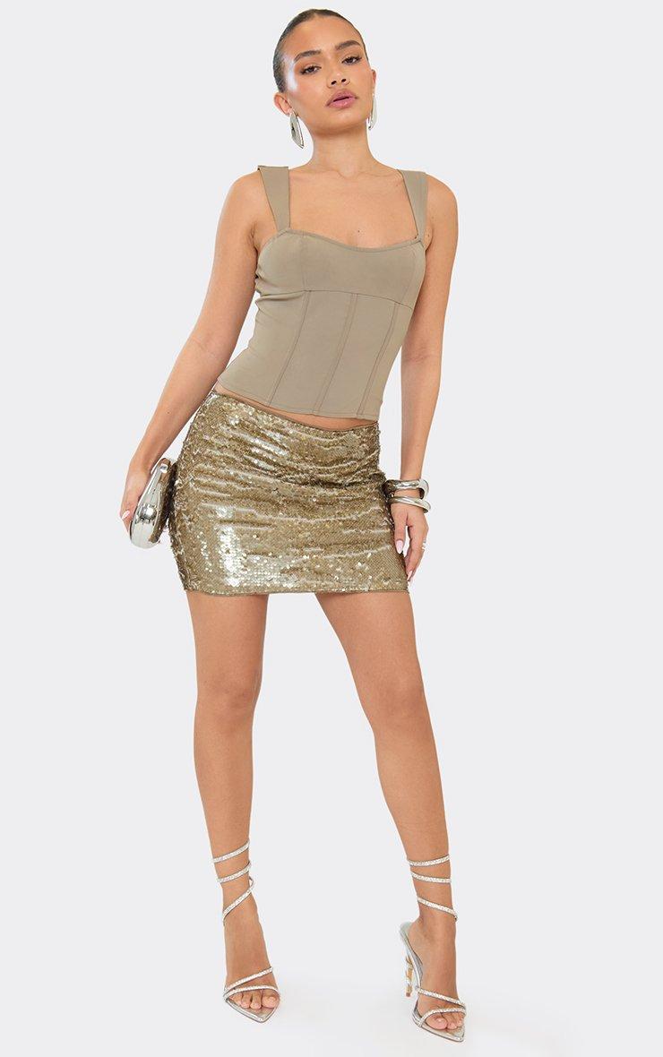 Mid Rise Sequin Waistband Panel Mini Skirt In Khaki