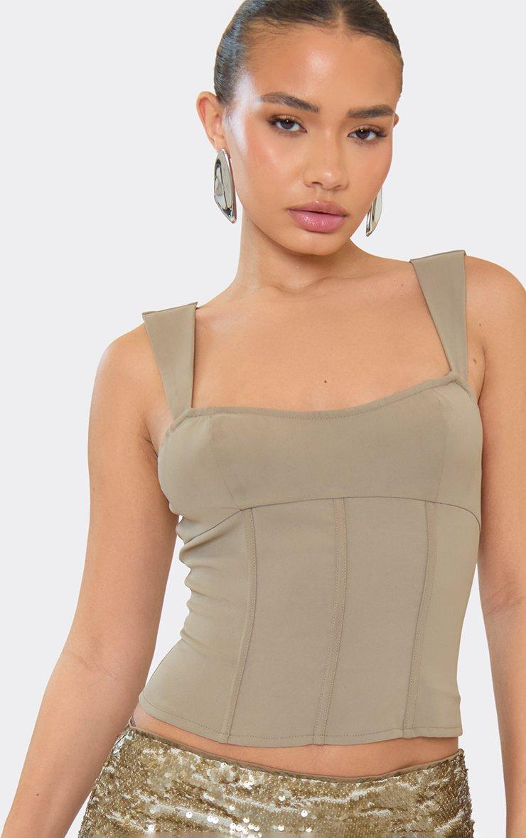 Long Sleeve Shoulder Pad Open Back Top In Khaki