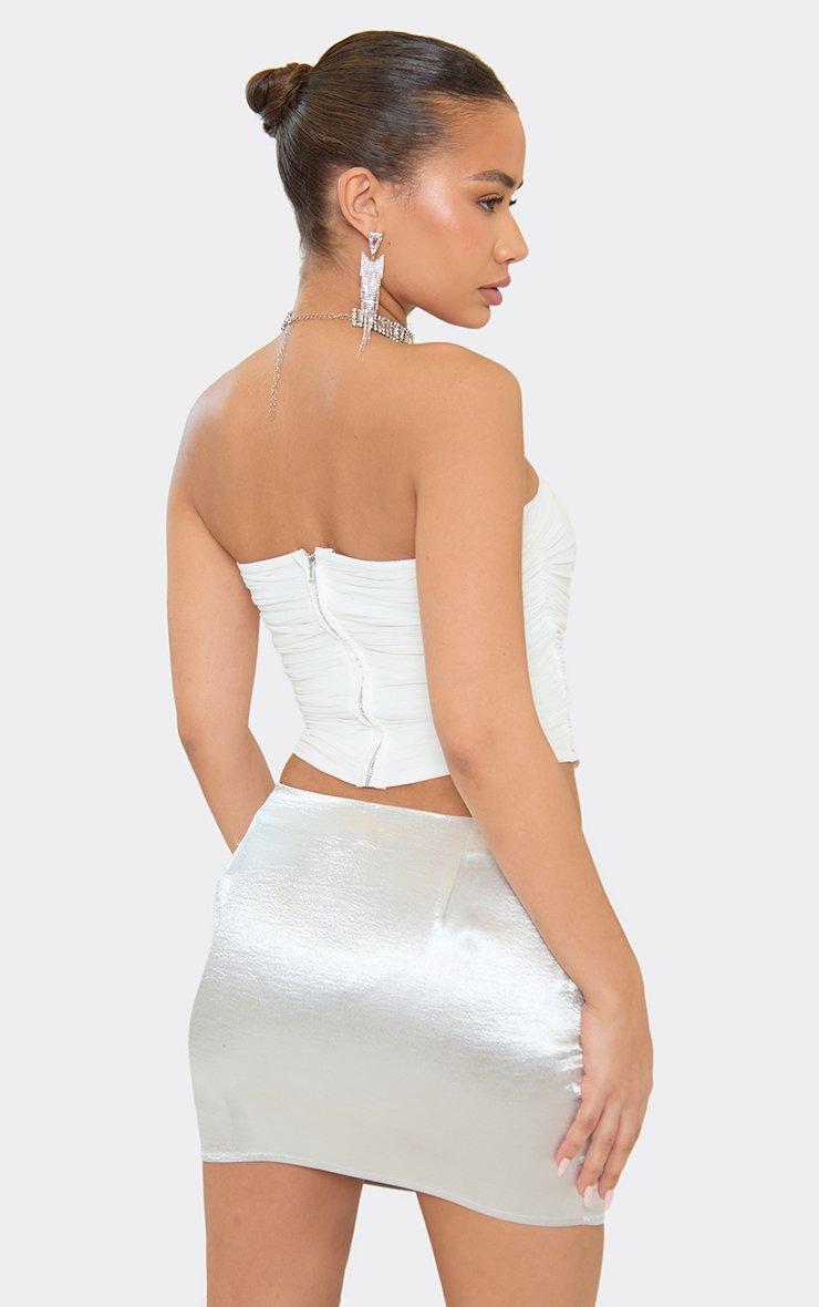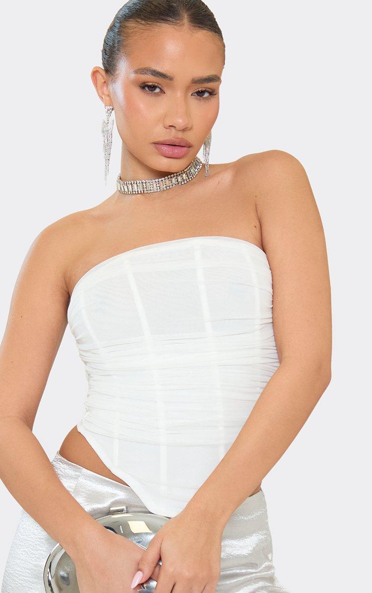 Bandeau Ruched Curved Hem Corset In White Mesh