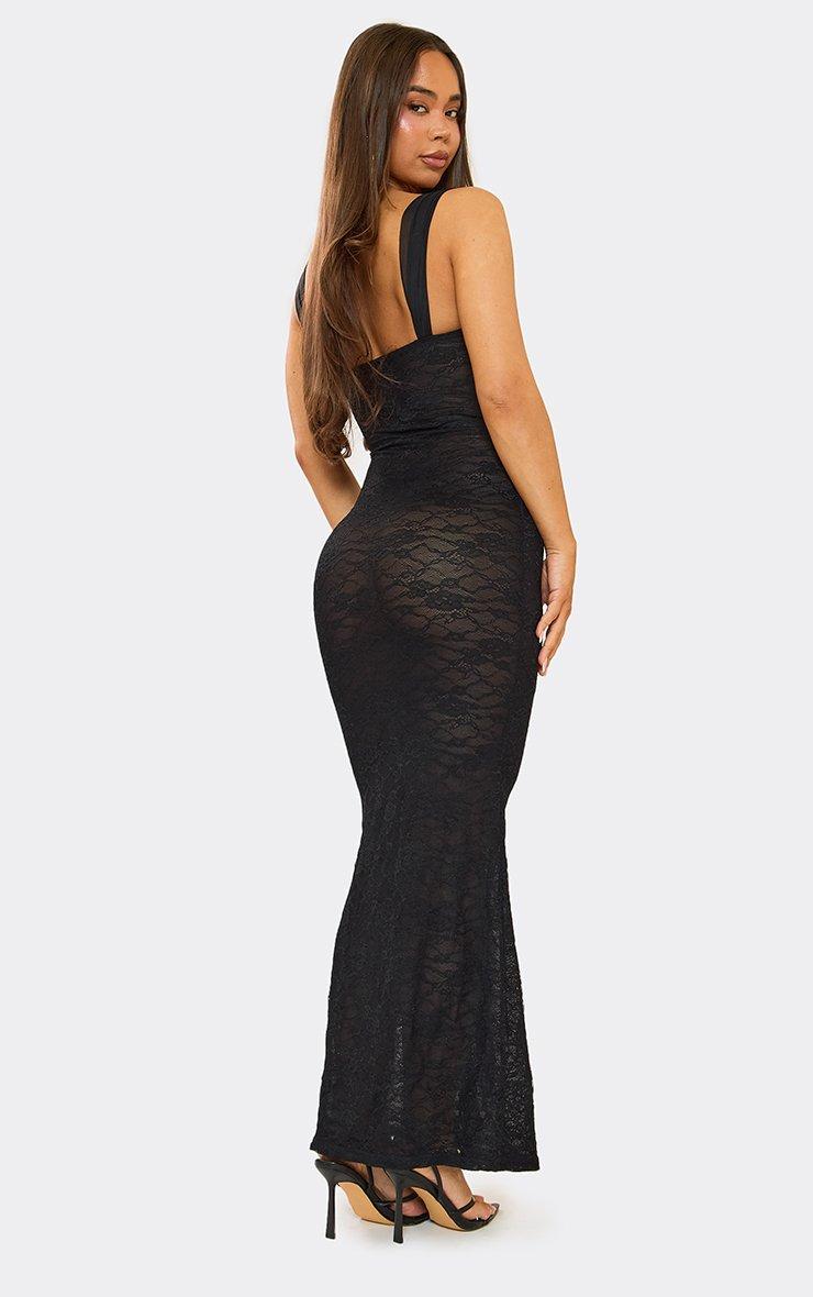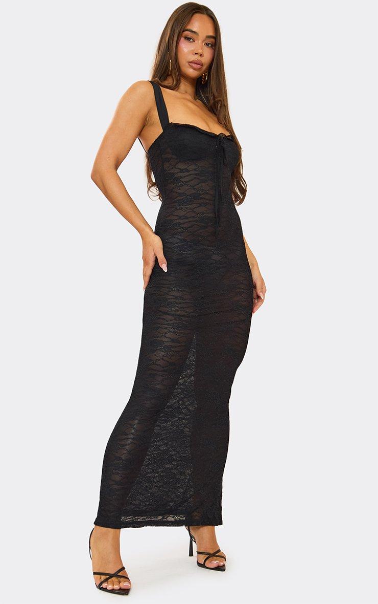 Square Neck Tie Front Maxi Dress In Black Sheer Lace