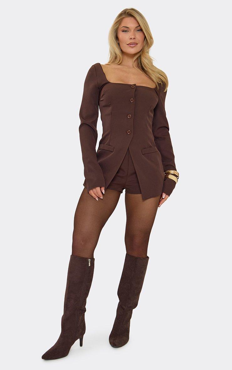 Long Sleeve Square Neck Button Down Split Front Playsuit In Chocolate Brown