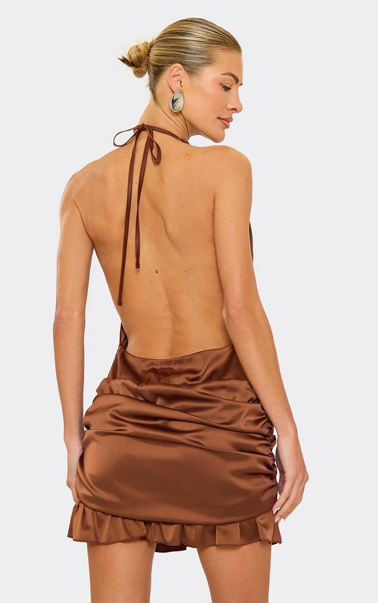 High Neck Halter Ruched Detail Frill Hem Mini Dress In Brown Satin
